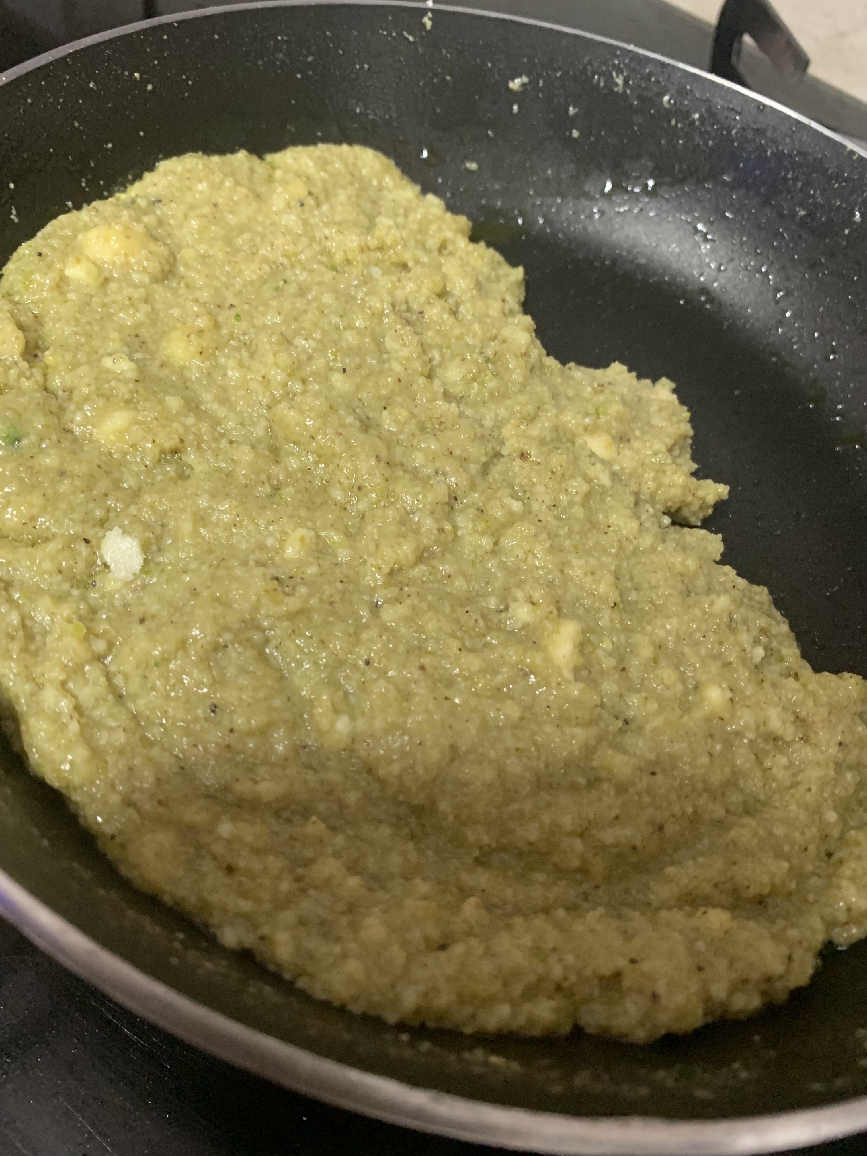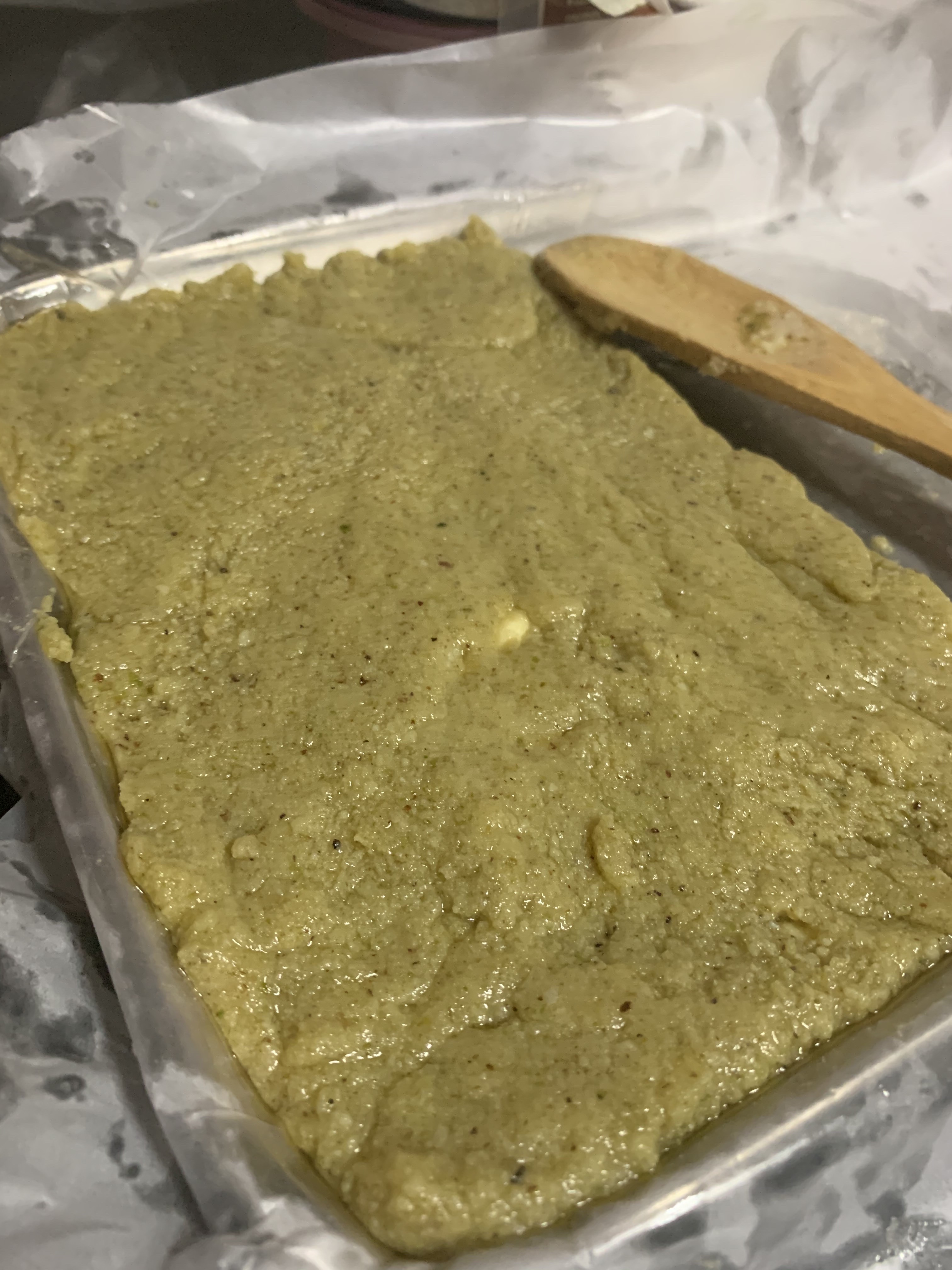 Transfer this slowly and with your spatula, make an even layer. At the start it would be a little sticky but as you keep doing shaping, it would form a even layer.