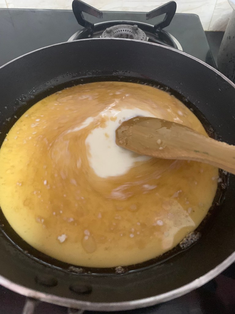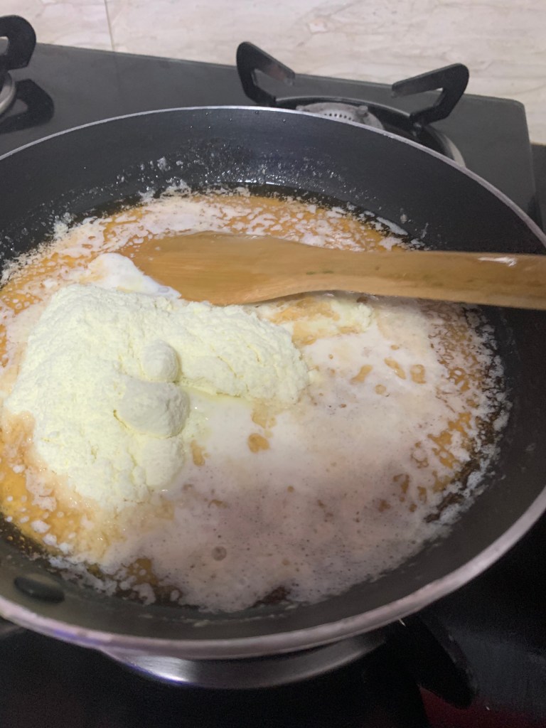 . Add the milk and give it a good mix. As the milk starts to boil slightly, add the milk powder in batches. Don’t add it all at once as then the mixture would be lumpy.