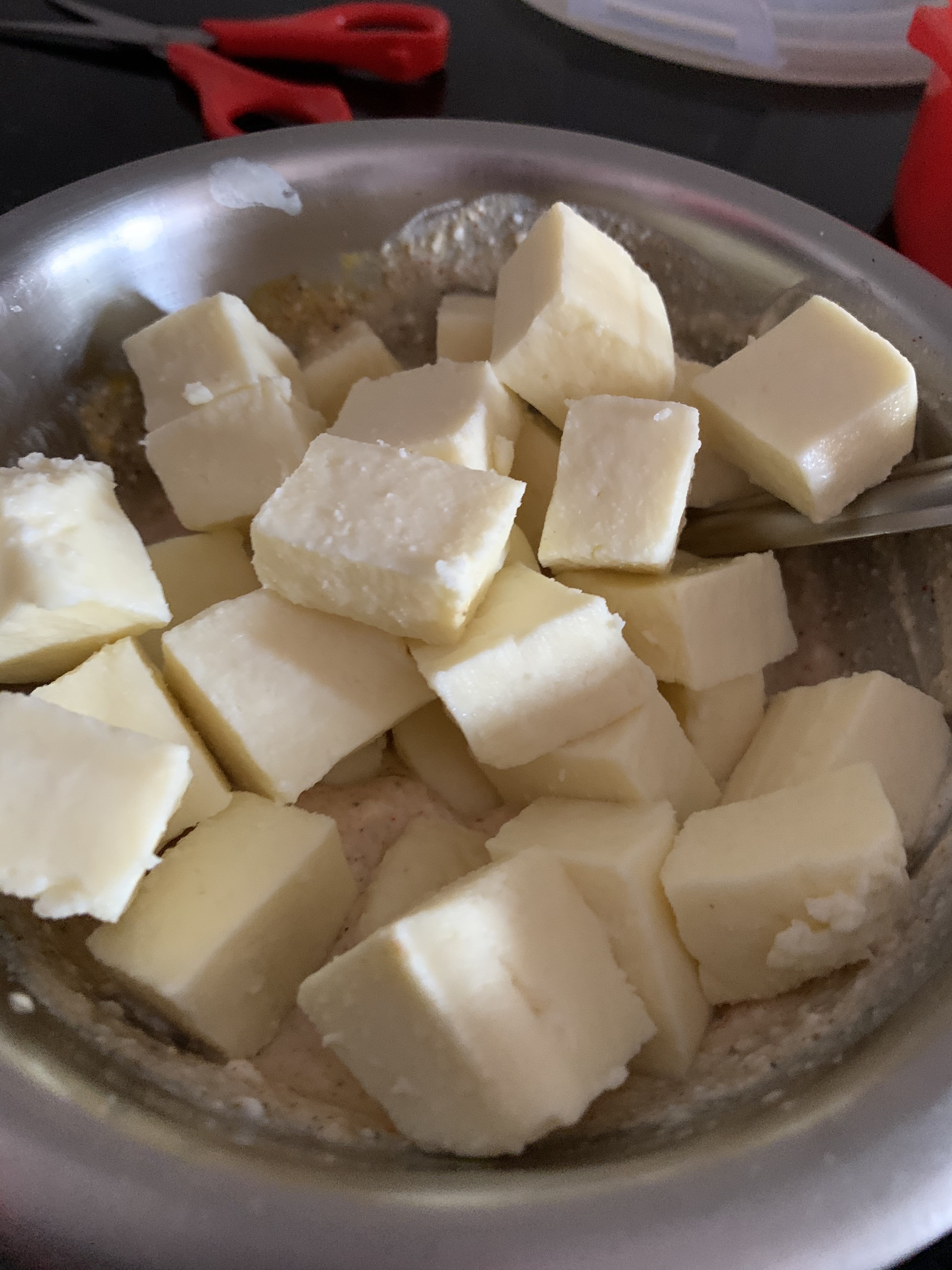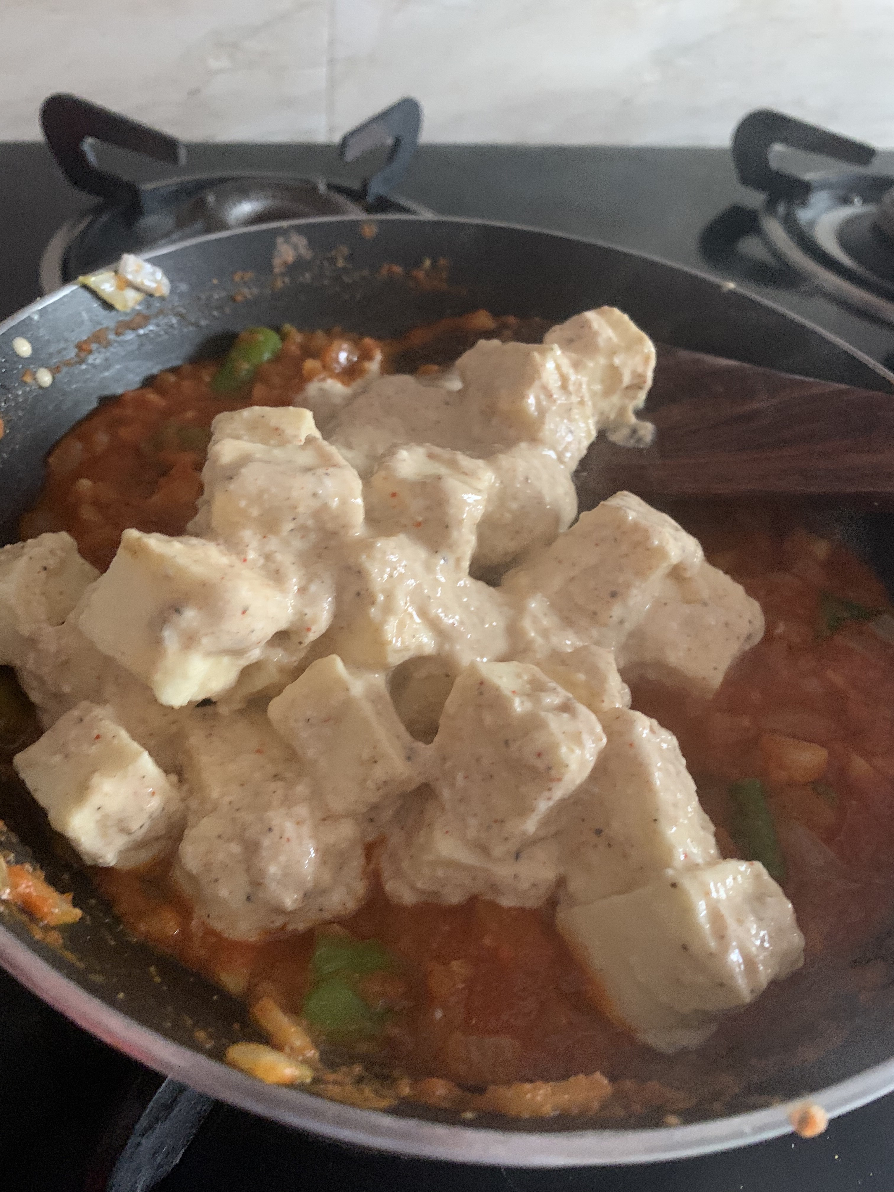 . Fry these in oil and then add the marinated paneer. Give this a good mix and add any spice and salt as per you taste. This recipe is usually a bit spicy but you can customise.