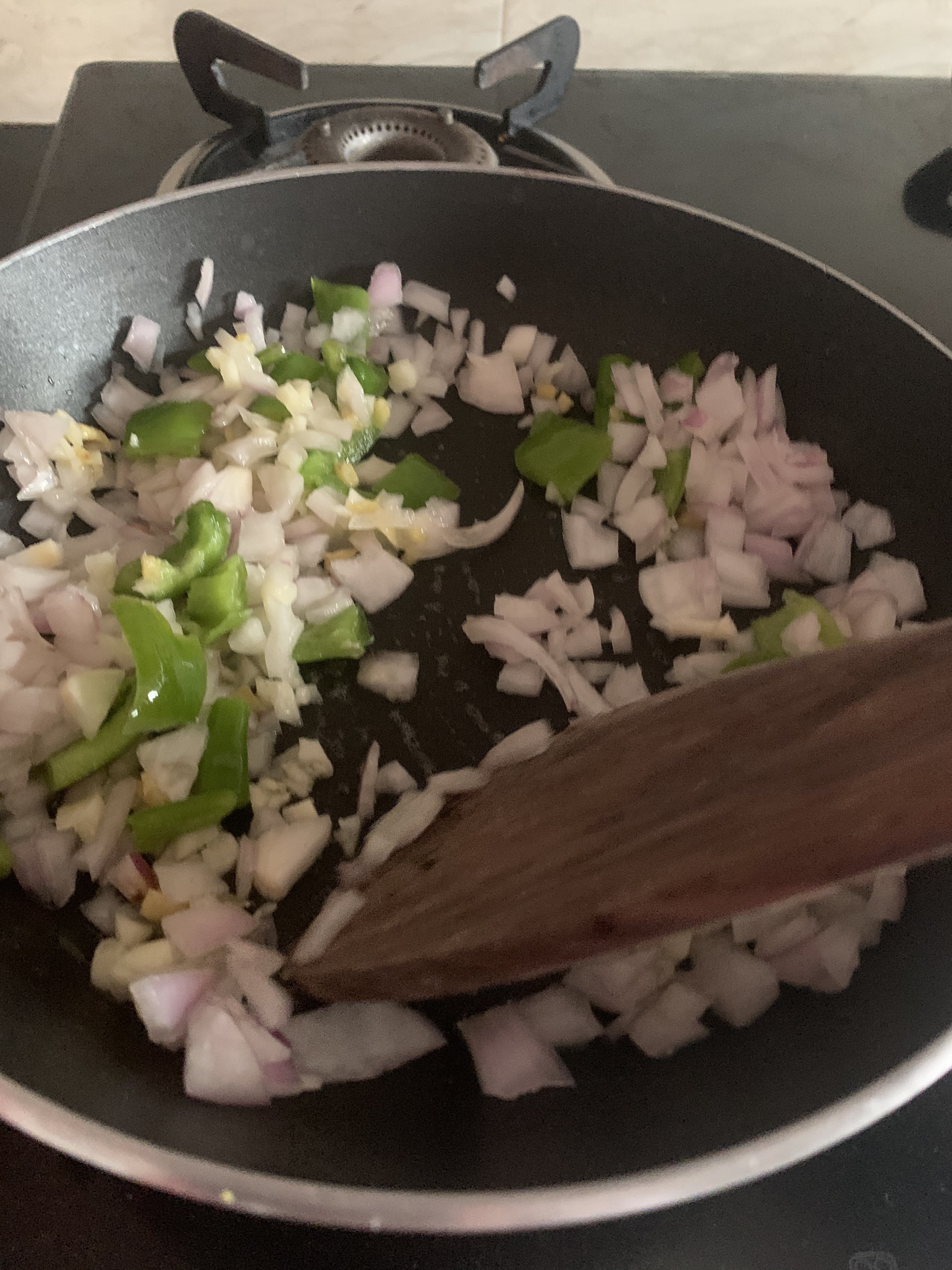 . Chop any vegetables you like and ginger and garlic. Here I’m using onion and capsicum.