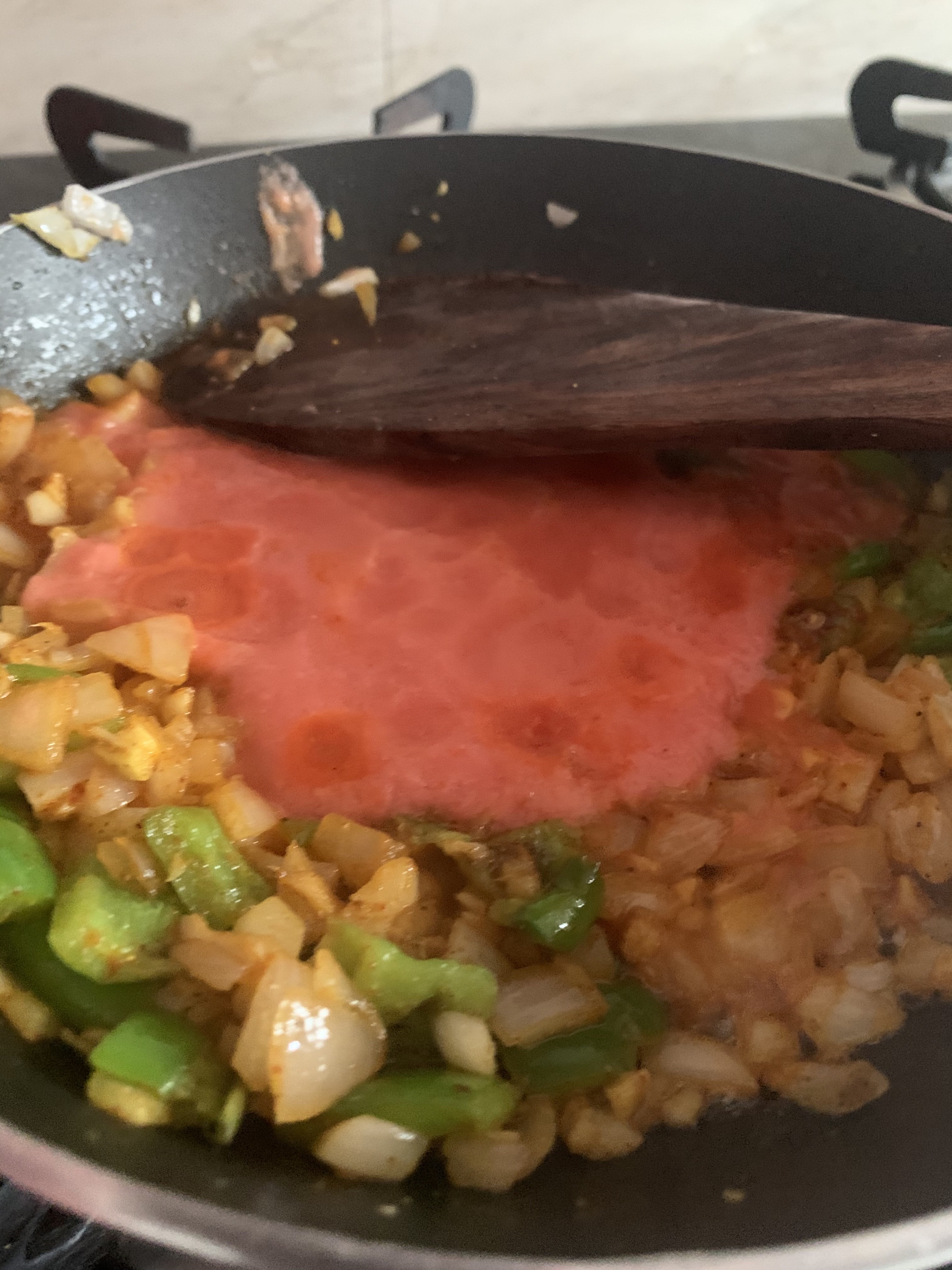 . Add them in a pan with a bit of oil and then add the purée of tomatoes.