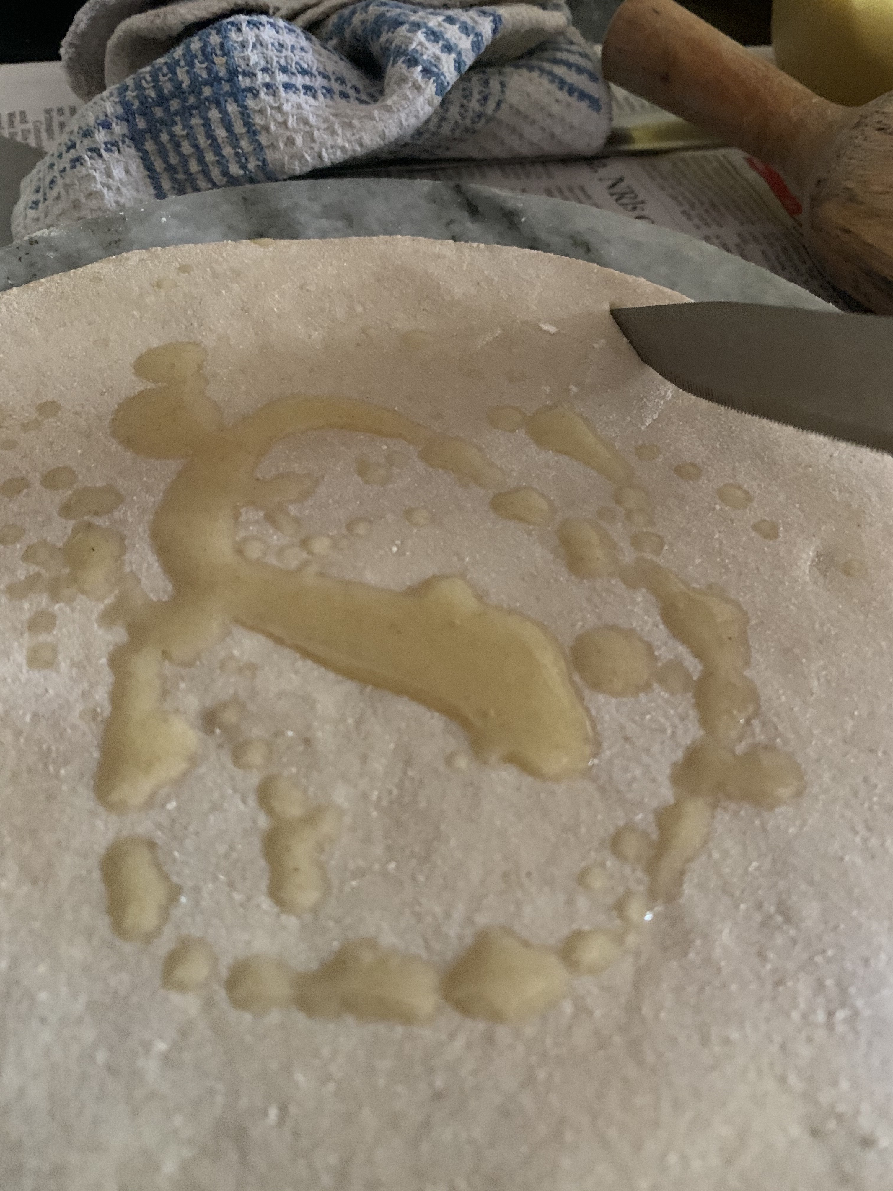 Apply some oil and dust some flour on both sides. Sprinkle some salt.