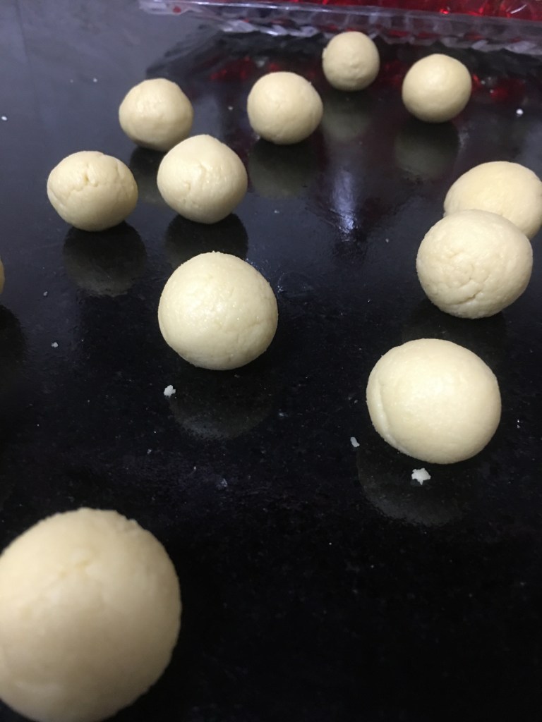 . Separate these into equal sections and make crack free balls. If the balls have cracks then while frying and soaking they might break.