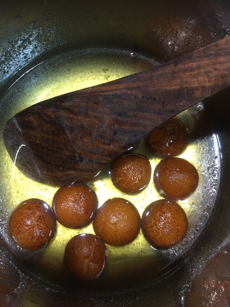 . Let these soak for about 1.5 to 2 hours. Now I would suggest that you fry the jamuns really tiny in size because they puff up on soaking but it’s all up to you .
