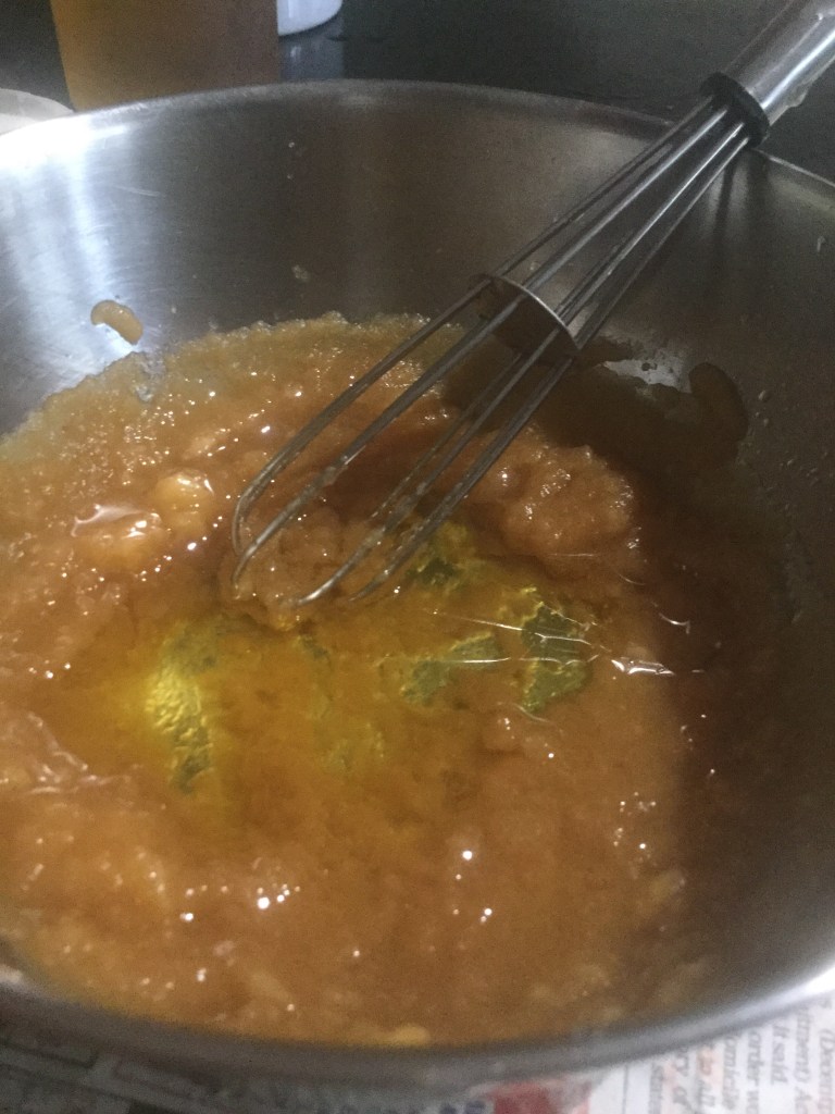 . Cut it vaguely into pieces and make a fine purée out of it in a blender jar. What we have here is basically applesauce. The taste of this is so magical that you wouldn’t even taste the apple after it bakes. You can also use bananas and any other pulpy fruit in place of apple.