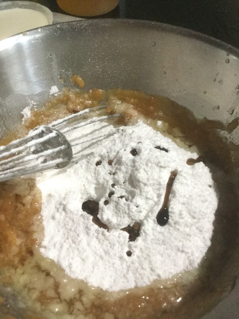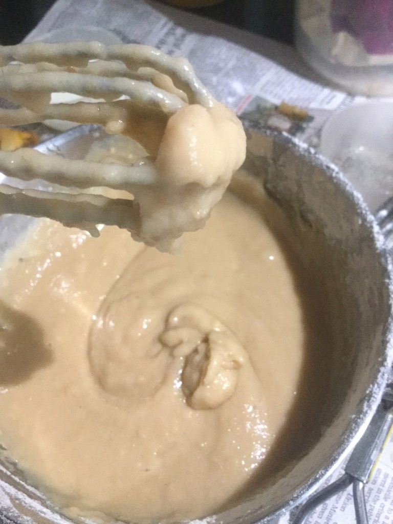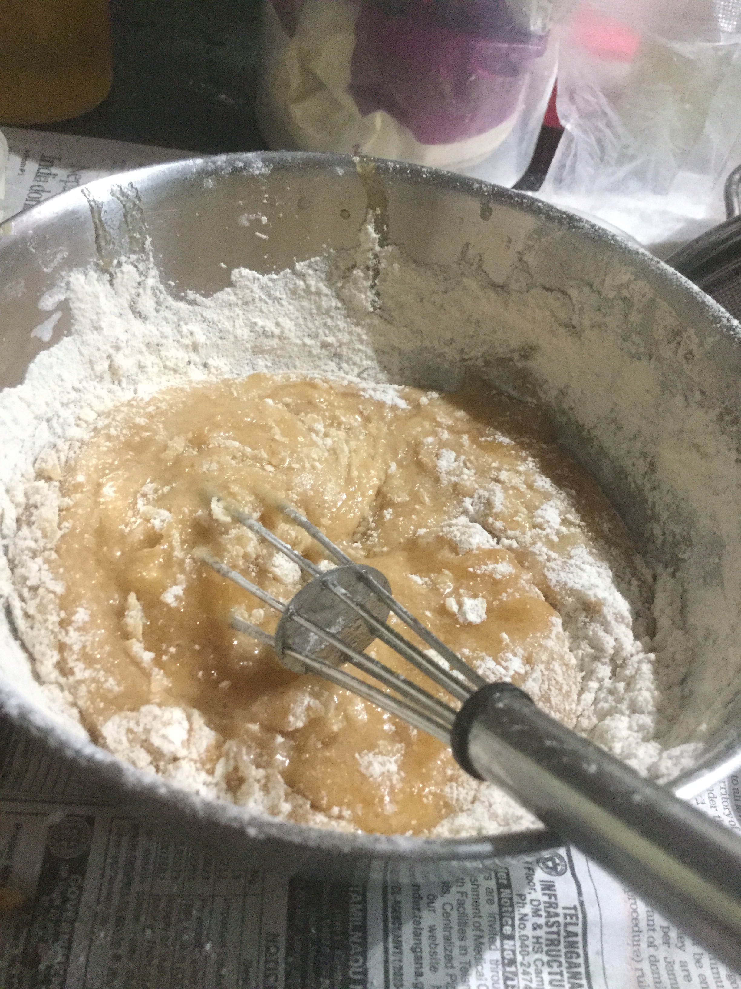 . To this add the oil and give it a good mix. To this add the sugar and vanilla and mix it as hard as you can.