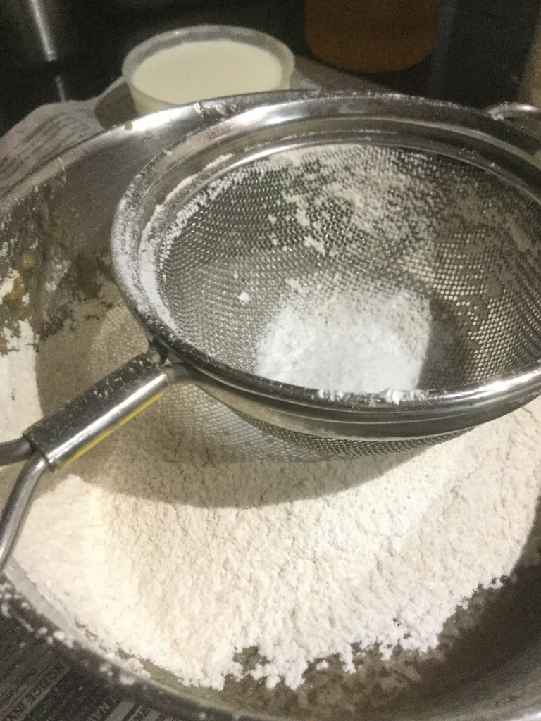 . To this add the wheat flour( sieved) as its not as light as maida. You can also used all purpose flour but wheat flour gives the best taste in this recipe. Sieve the baking powder and soda with this .