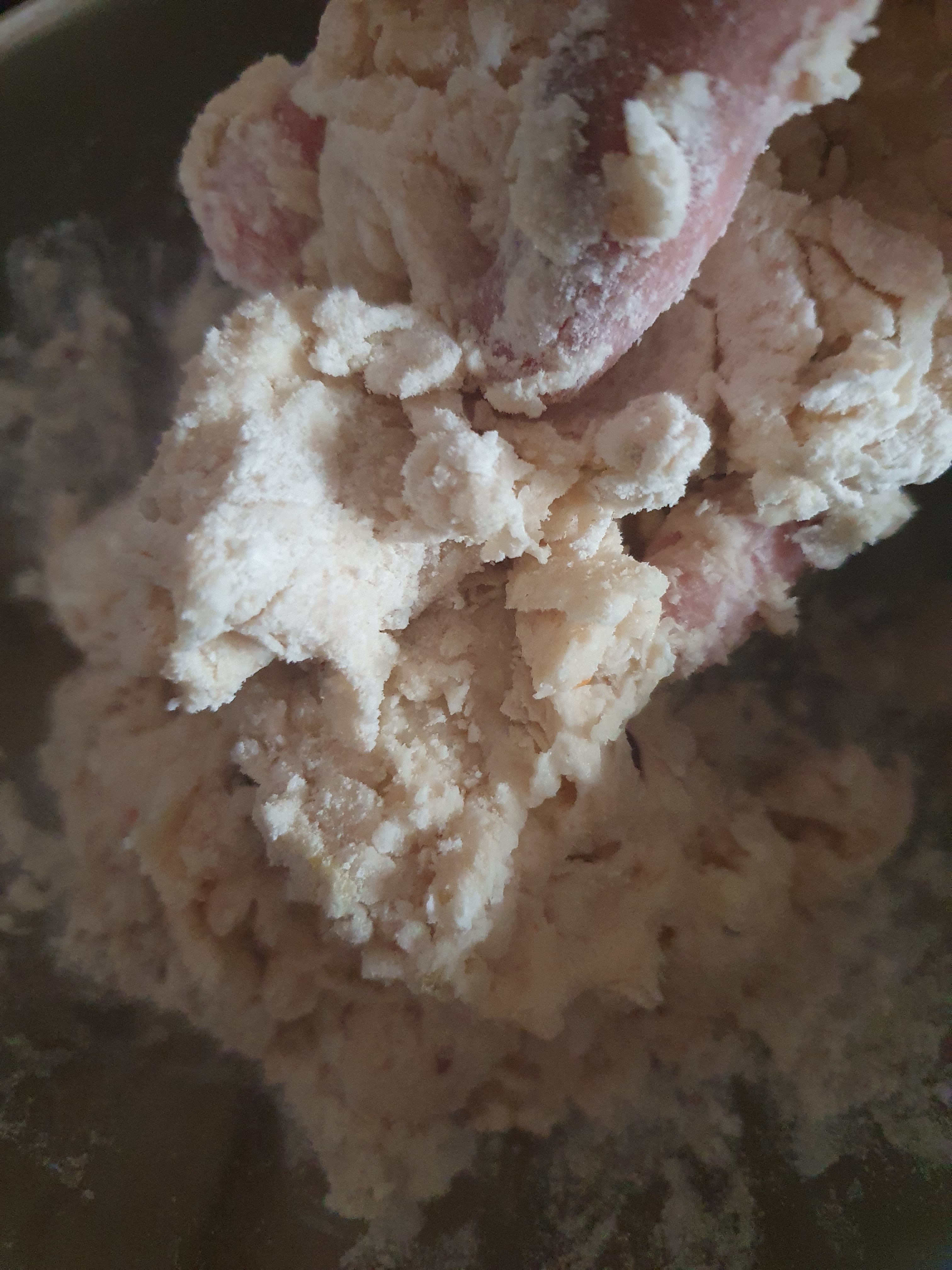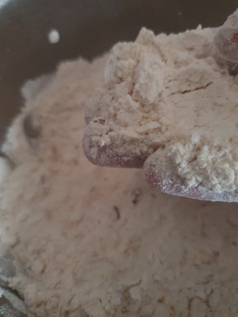 . For the dry ingredients, add the flour, oil and the spices and mix it nicely. Because of the oil, there should be tiny knots in the flour like this: