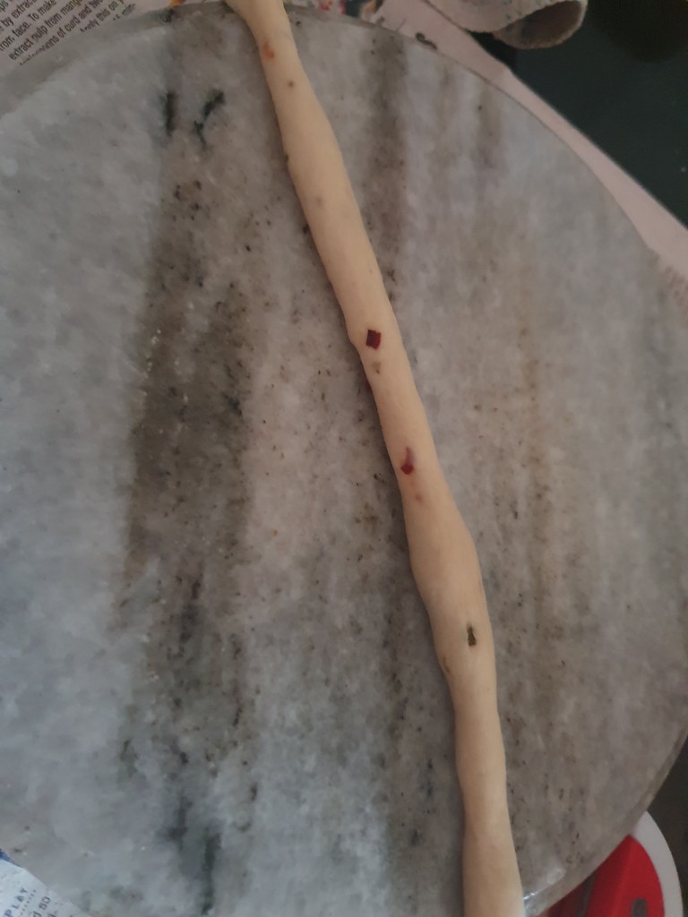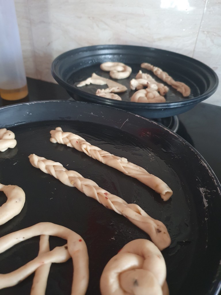 . For the wash, heat the oil and the spices till it starts to boil. Then apply it on the dough you’ve rolled out.