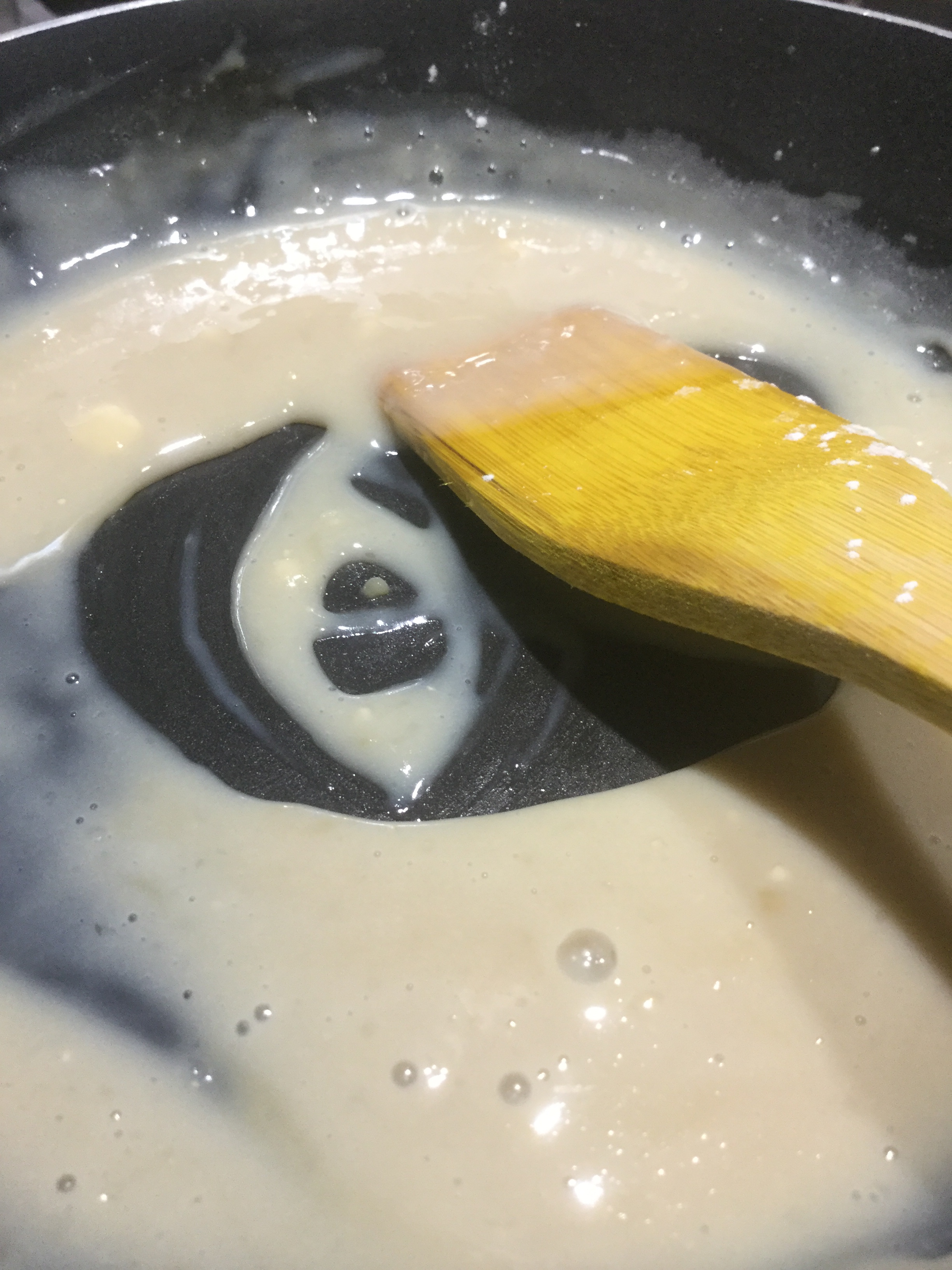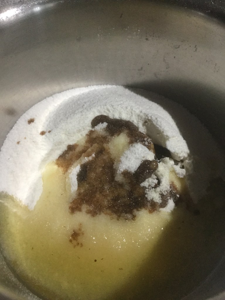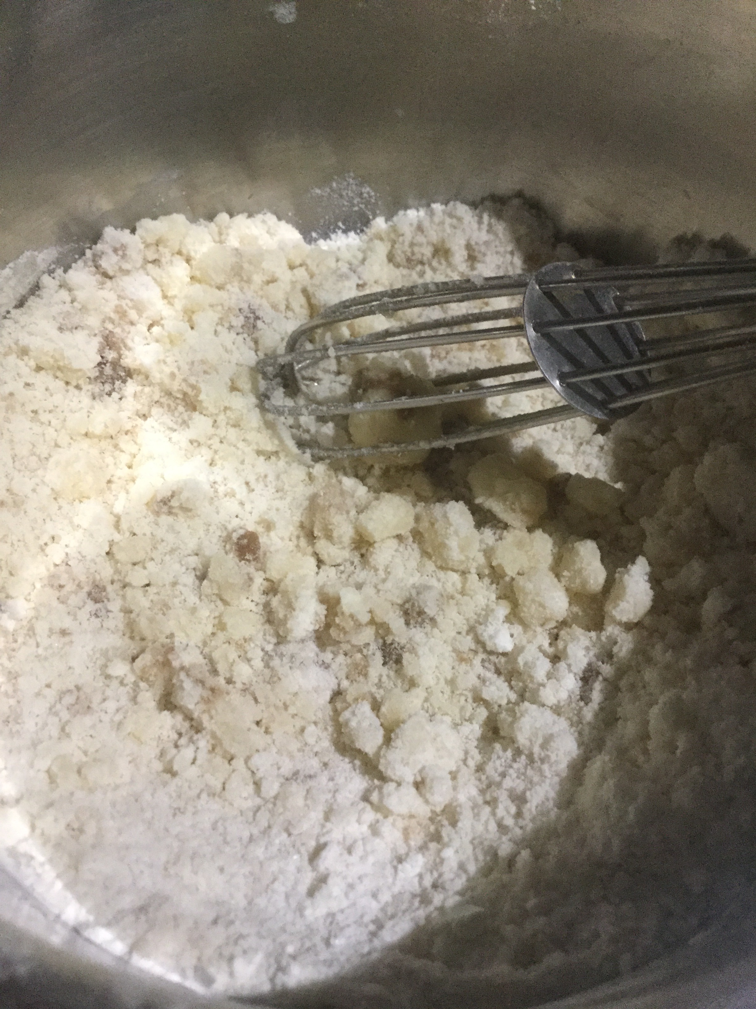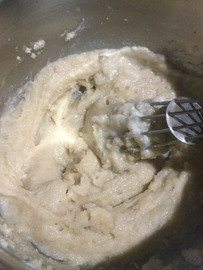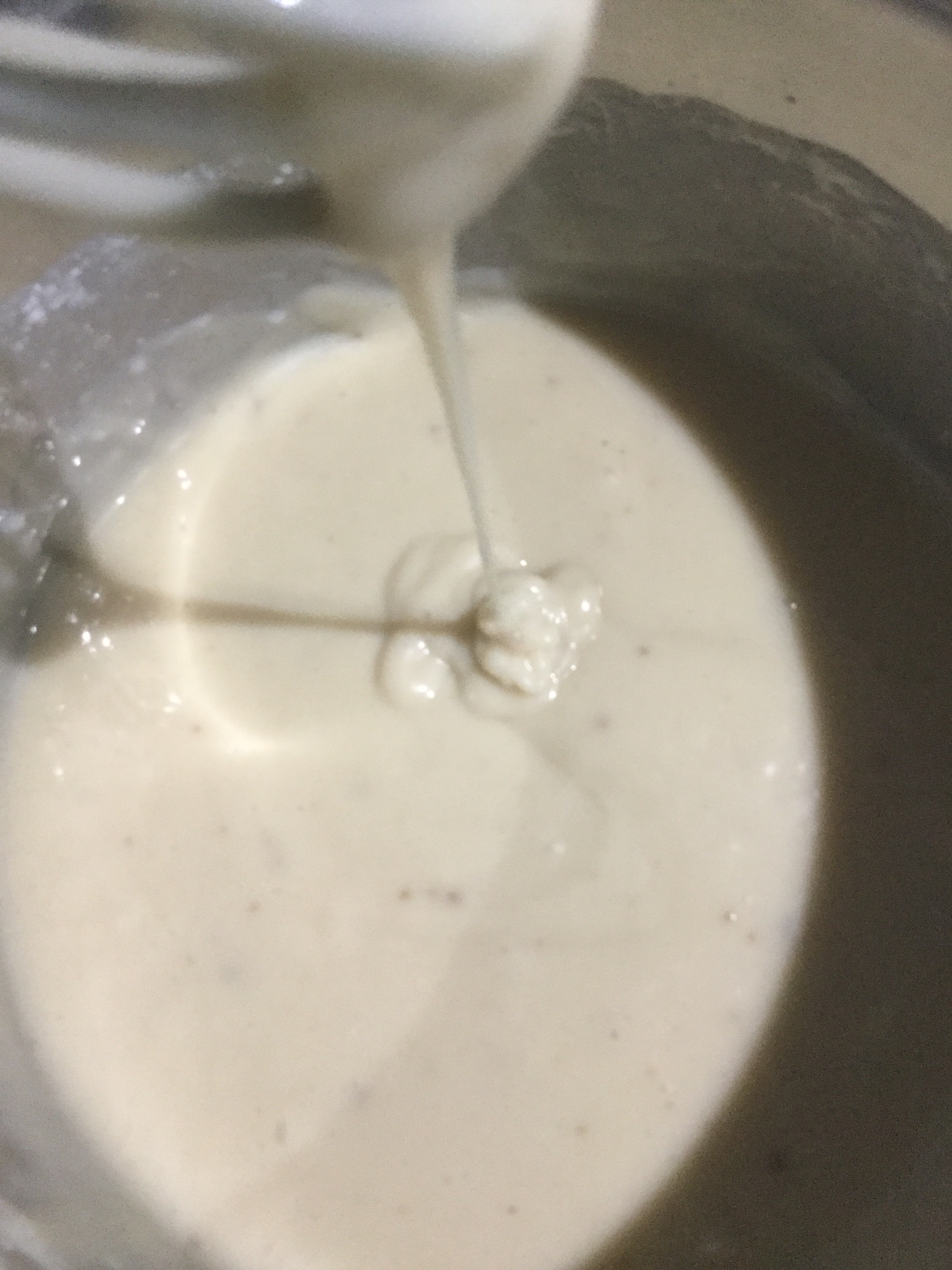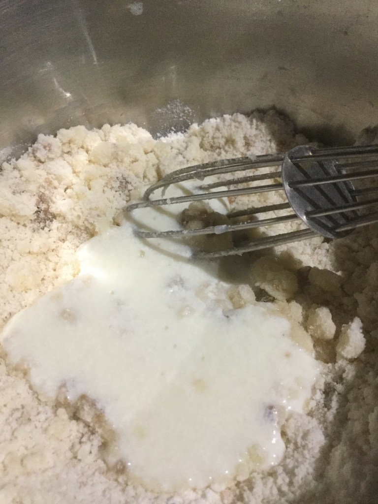 . When the milk has curdled slightly slowly add it to this mixture and then make a flowy batter like this.