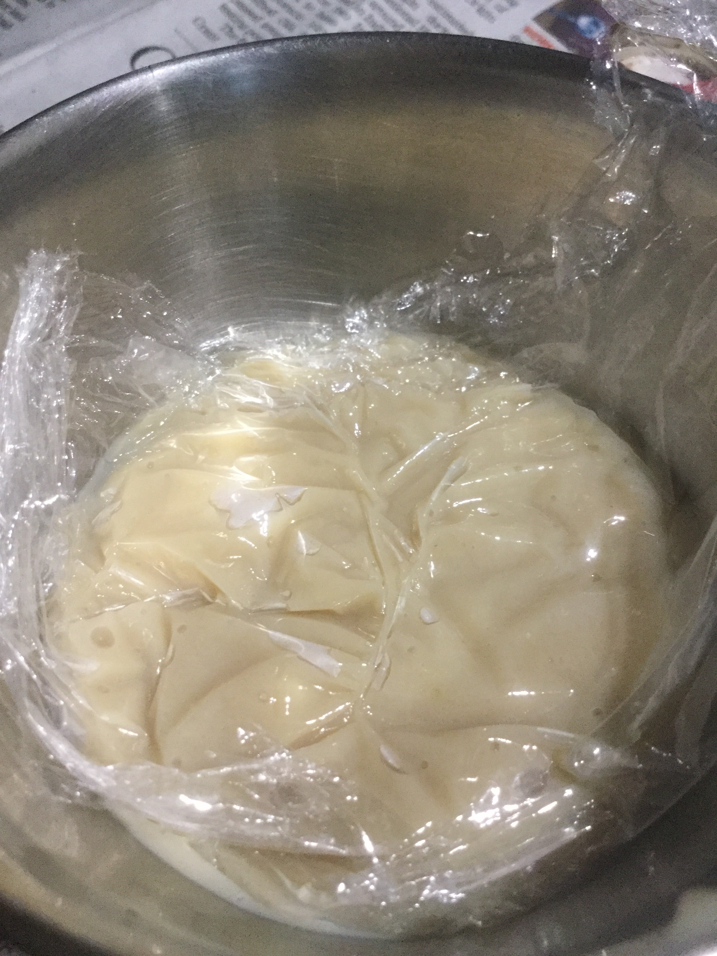 . On low flame, keep mixing it or else the mixture would burn. When it starts thickening, switch off the flame and transfer the mixture to a bowl and cover with a cling film or else a skin would form on the top layer.