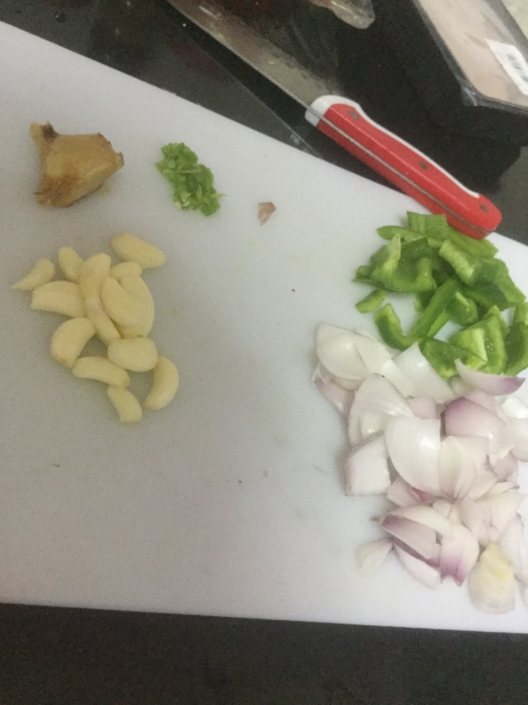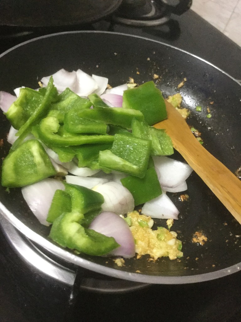 . First, fry the ginger and garlic in the butter and let the raw smell go away. Then add the vegetables in it.