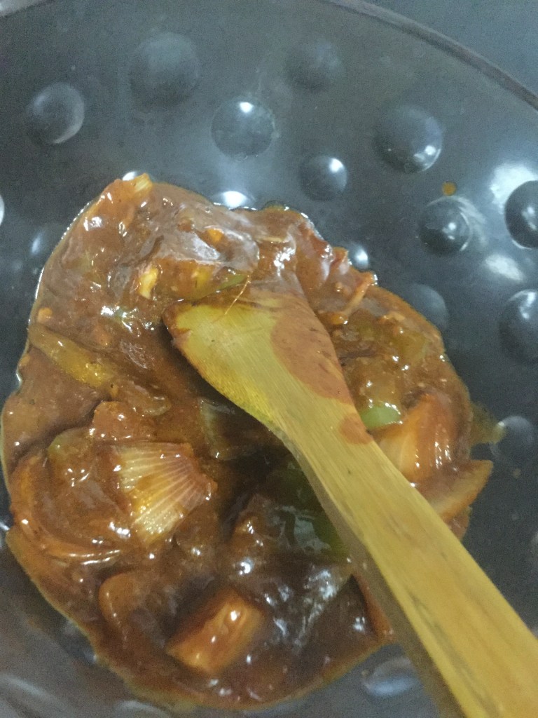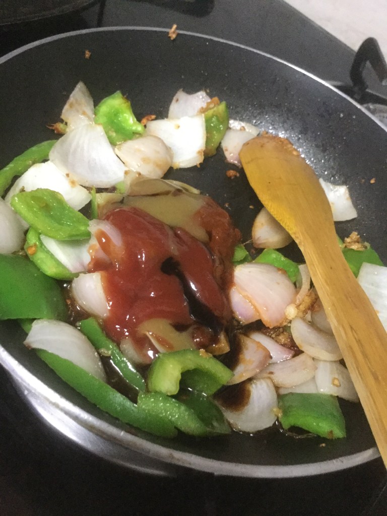 Once they are fried for 2 minutes , add the sauces and then add a little water to thin it out.