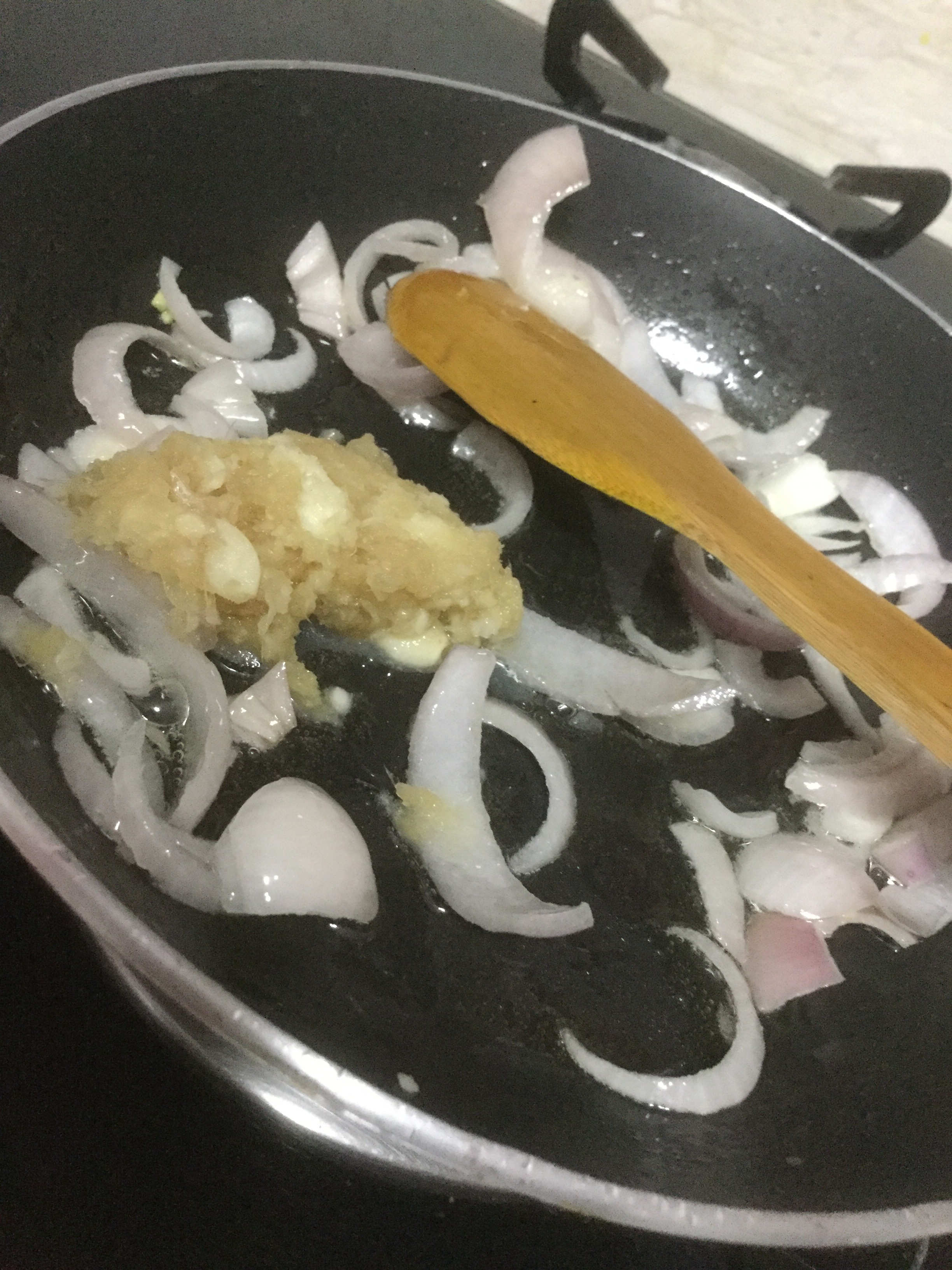 . First , make paste out of ginger and garlic and add it to a pan with oil.