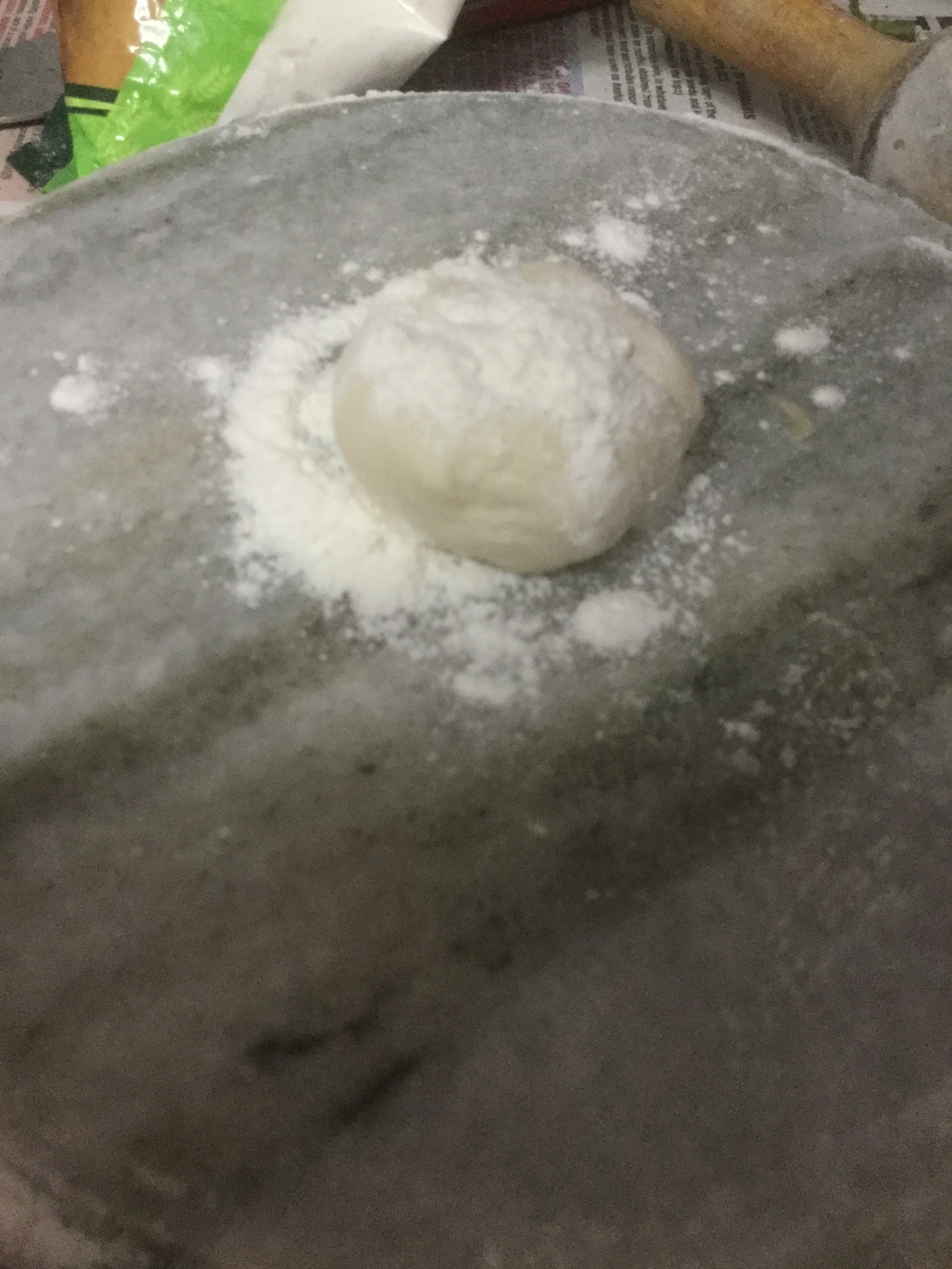 . First, take a small ball of dough and roll it on a rolling board with some flour.