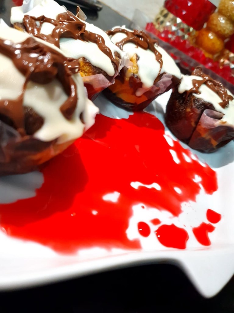 . Then add water, sugar and colour in a pan and make a little thin sugar syrup. After that pour it on the plate like a splash of blood.