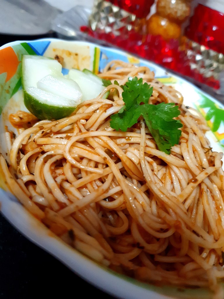• Transfer the spaghetti to a serving bowl and the the sauce over it. Here for decorating, I have cut out a piece of cucumber as a flower. Also put a leaf of coriander in top. Keeping it in cold water, makes sure that it looks very fresh.