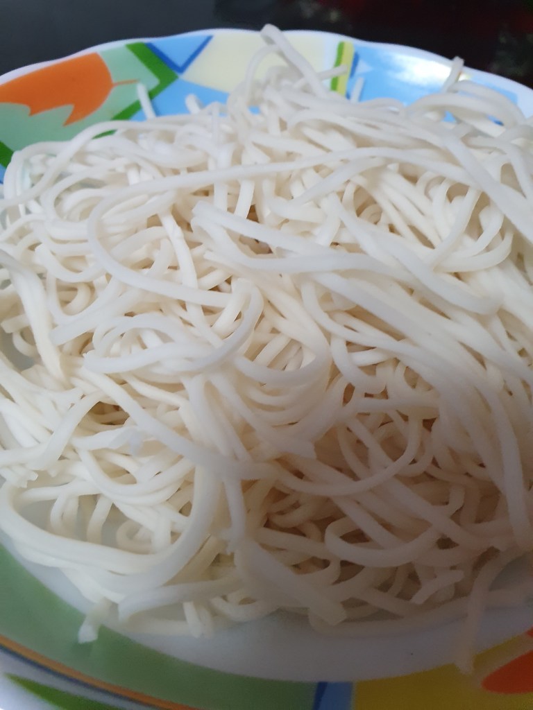 1 packet boiled spaghetti ( in water and a tsp of oil )
