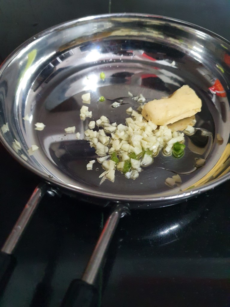 • First, add butter to a pan and let it to melt . Then, fry the green chilli and garlic with this.