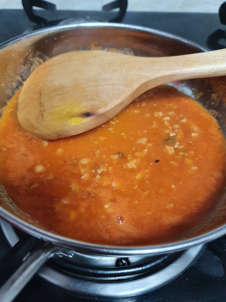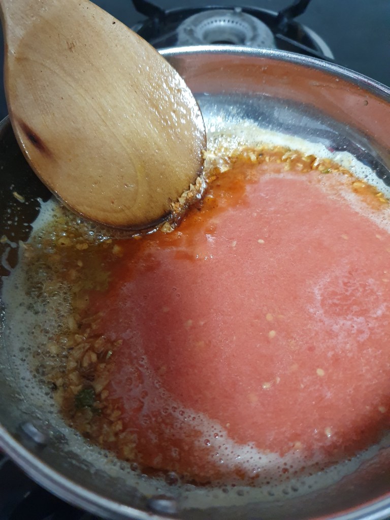 • Then add the tomato purée in this. Within no time, you would see the colour change if you have blanched the tomatoes properly.
