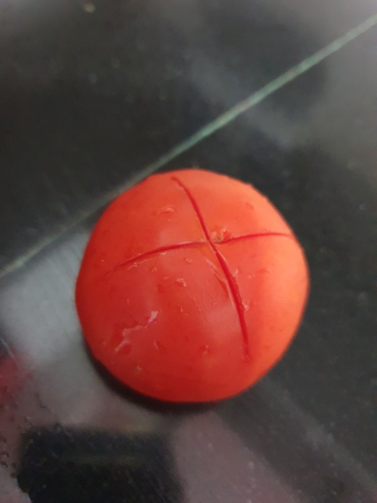 • First, remove the top part of the tomato and make a slit on it with a knife on the opposite side.