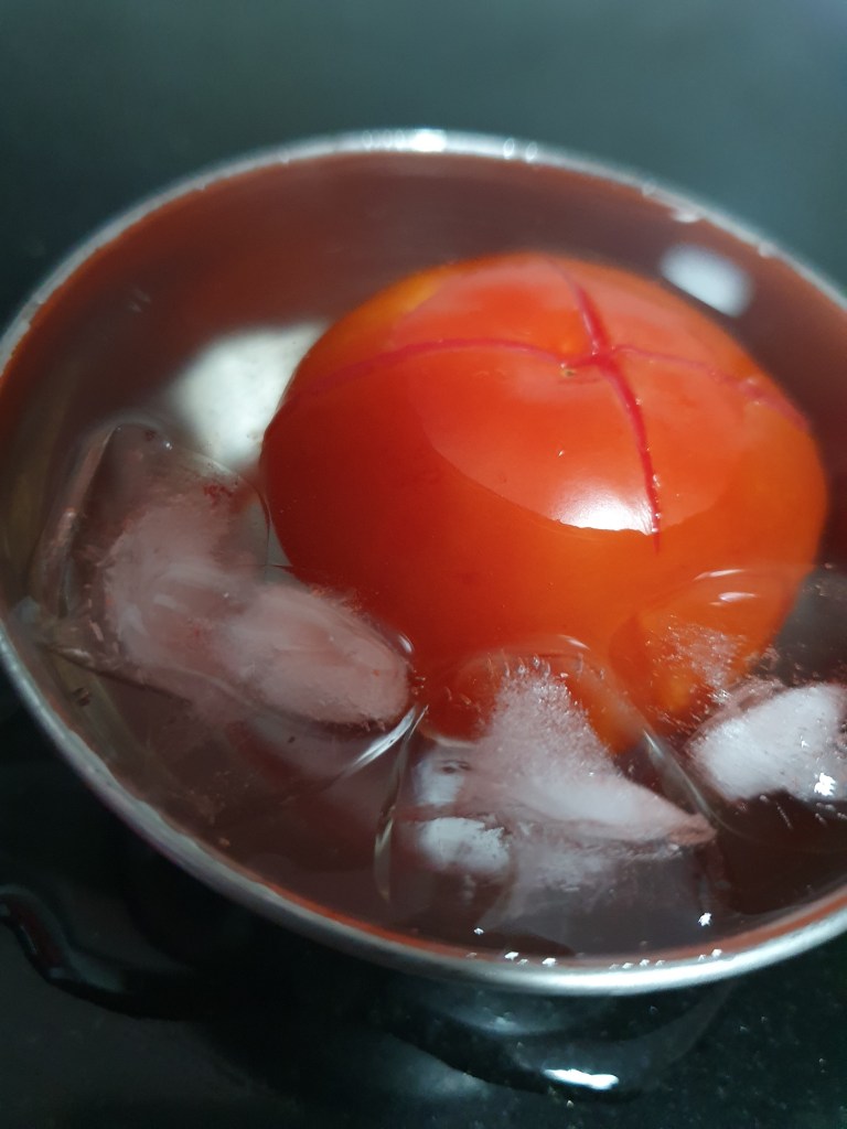 • Then place the pan with water on the stove . Once the water starts to boil, add the tomatoes with the slit side facing down.