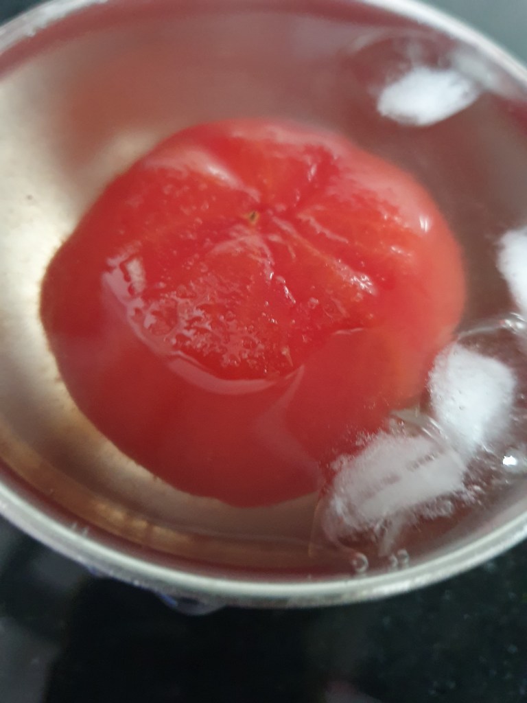 • Then, let them rest for 5 minutes in the water. Remove the skin if the tomatoes with the help of the slit made earlier. If you want you can remove the seeds or you may keep them. It’s all up to you.