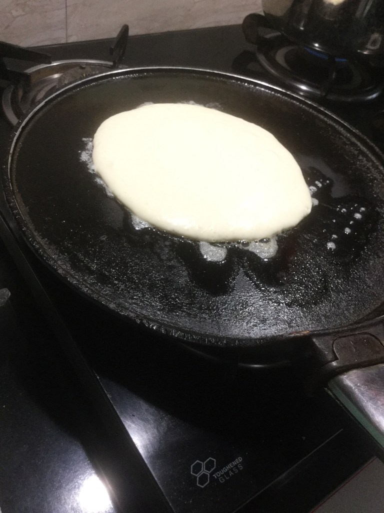 . Then heat a pan and put some butter on it. Once it’s melted, pour about 1/4 cup batter and let it to cook for 2-3 minutes on medium flame.