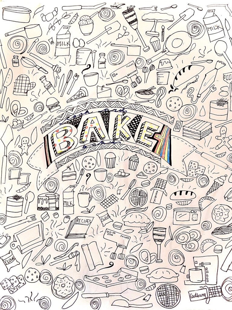 Before we start on for today’s recipe I wanted to show you something. I am usually more of a calligraphy person in art but this time, I tried a doodle. That day, instead of trying out recipe in reality, I thought why not to doodle them? Here is a baking and cooking doodle that I recently tried out: