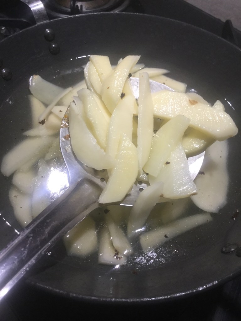 First, cut the peeled potatoes in a wedges shape. If there is time before you need to serve these, you can place them in water so they don’t get black.