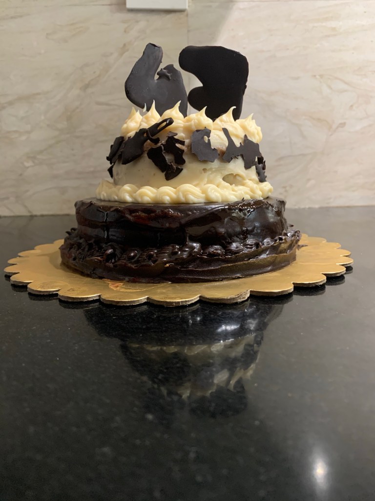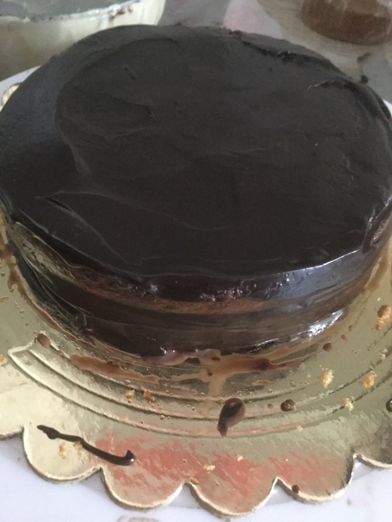Repeat the process for the next layer and coat the cake thoroughly with ganache. I am doing the same process for the smaller cake but with white chocolate ganache.
