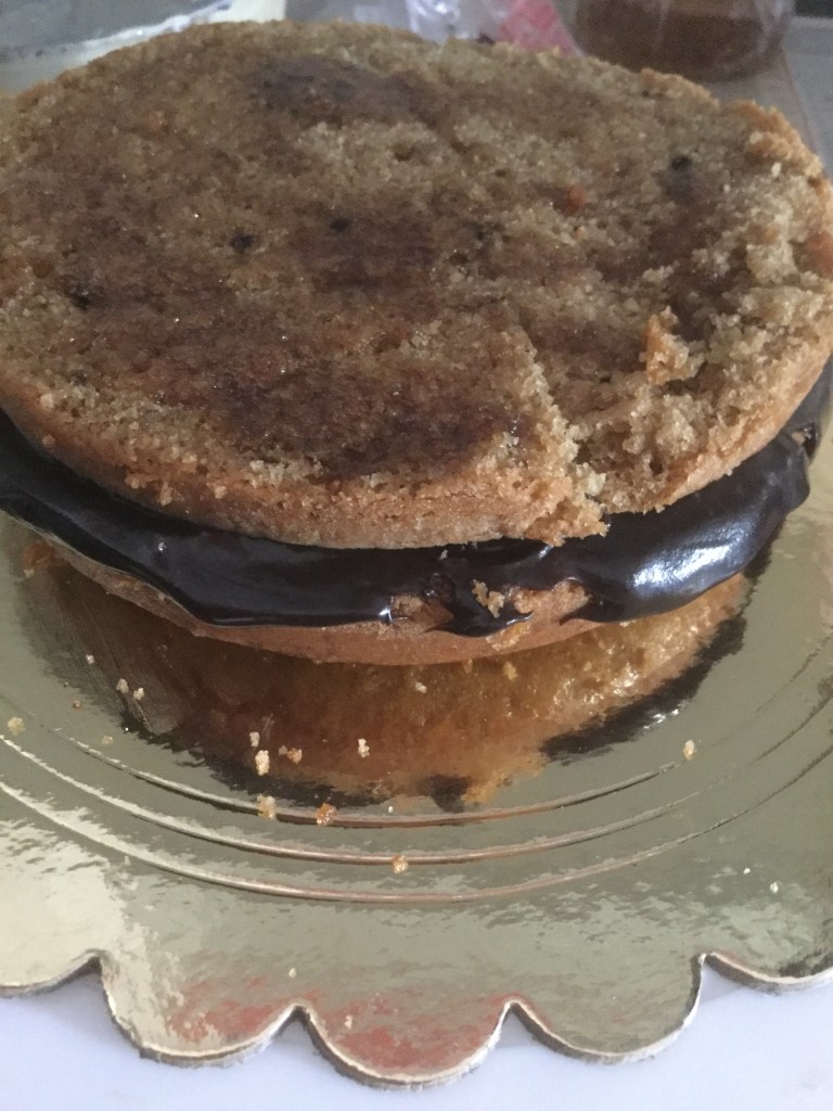 Mix together coffee, sugar and water and soak the first layer with this syrup. Then, add the ganache in a piping bag and put it on top of the layer.