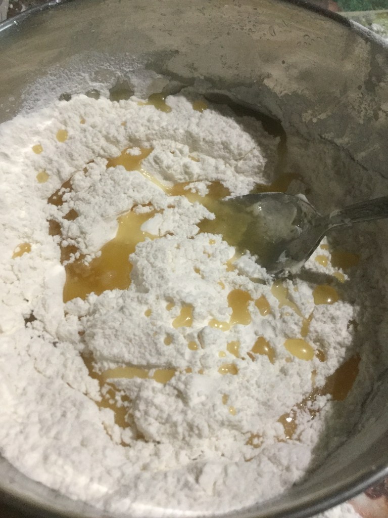 First, add salt and flour to a bowl and mix well. Then, add oil and make sure that the flour is rubbed well with the oil.