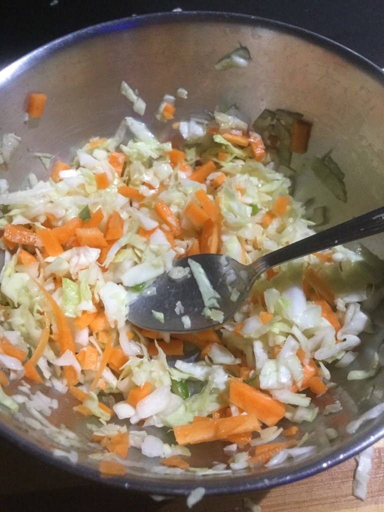Then, add a tsp of salt and let it rest for 15-20 minutes. When salt is added, what happens is that the vegetables release their water which is exactly what we want.