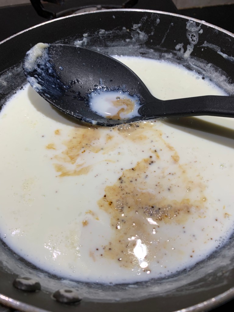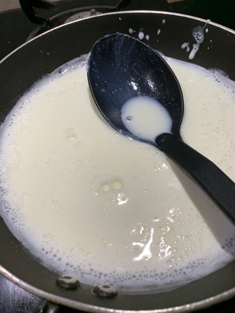 Add this to the milk boiling in the saucepan and stir continuously or it may permanently form lumps. When it is thick and its coating the spatula with a thin layer, add in sugar and coffee dissolved in a teaspoon of milk.