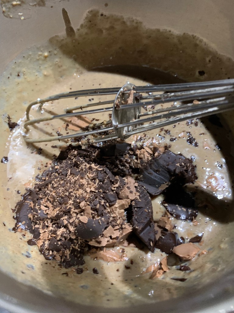 Switch off the flame and add the dark chocolate. The chocolate would melt with the heat of the custard.