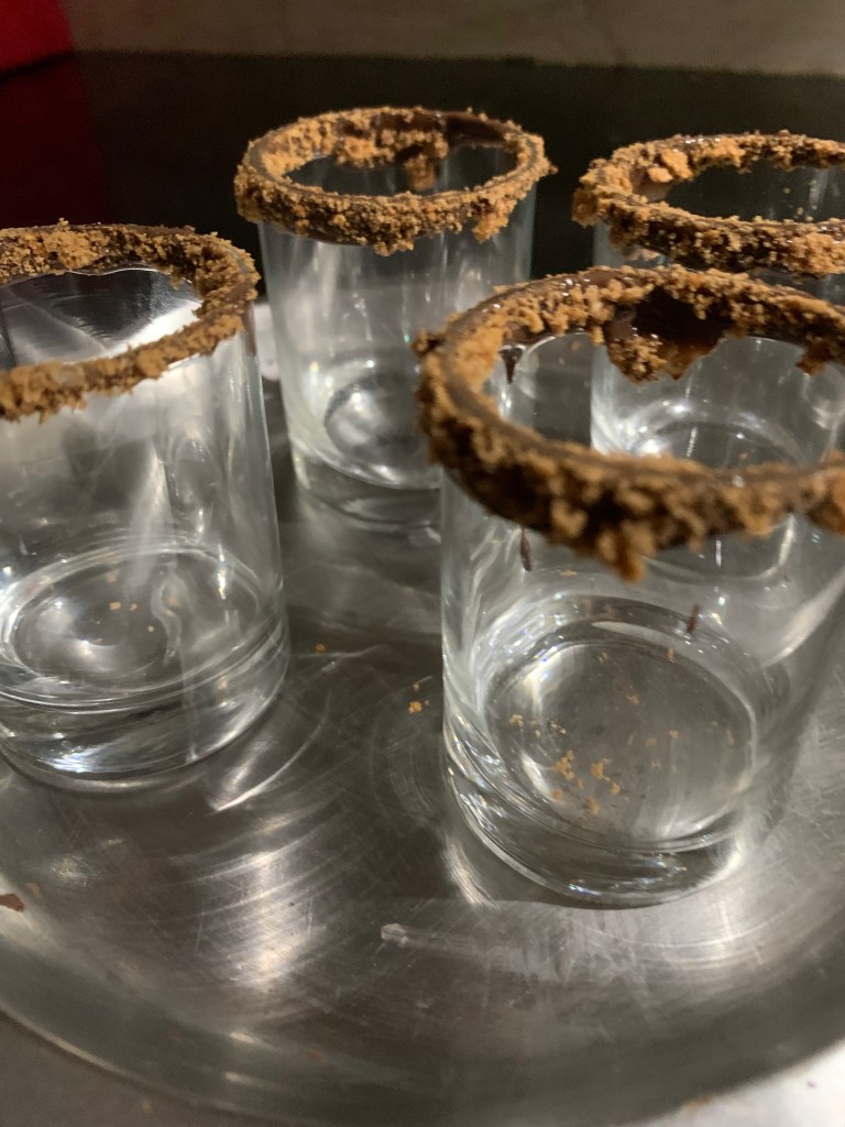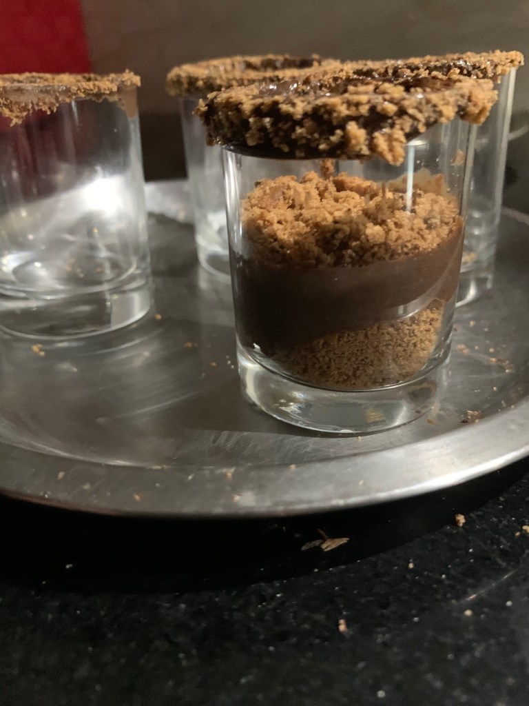 Now take any glasses which are preferably small.this recipe makes exactly four small glasses. Melt some chocolate and dip the rim of the glass into the chocolate . After that coat it well with some biscuit powder.