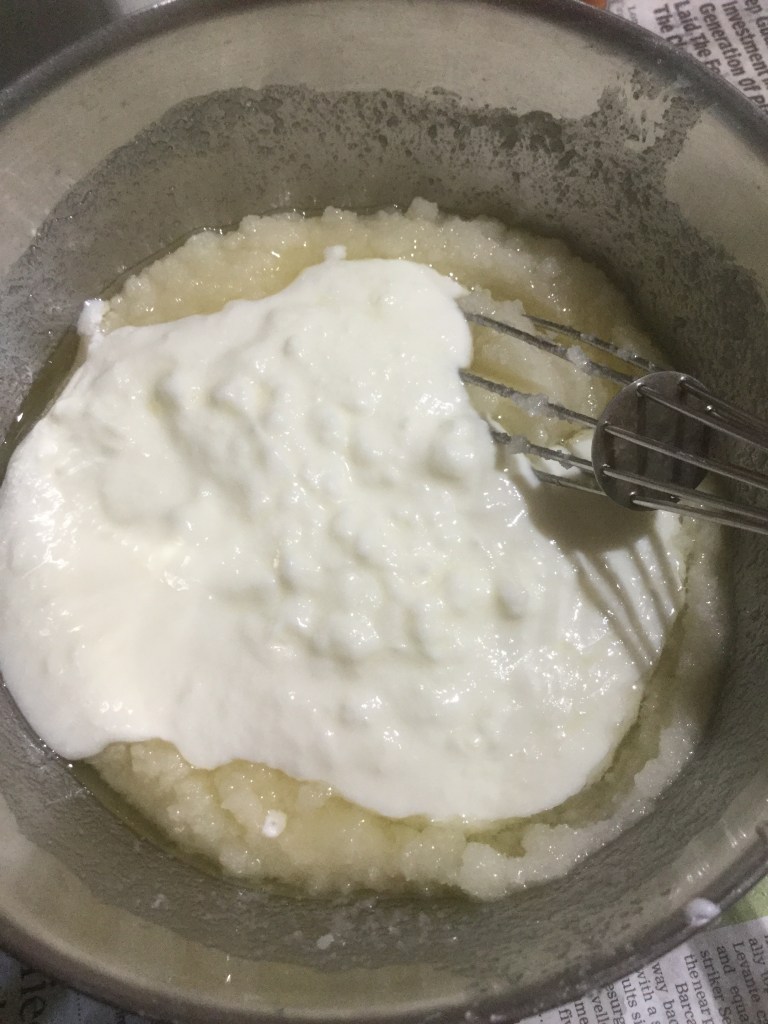 First, add curd, oil and sugar to a bowl and whisk very well. The sugar should be nicely mixed and then add vanilla.