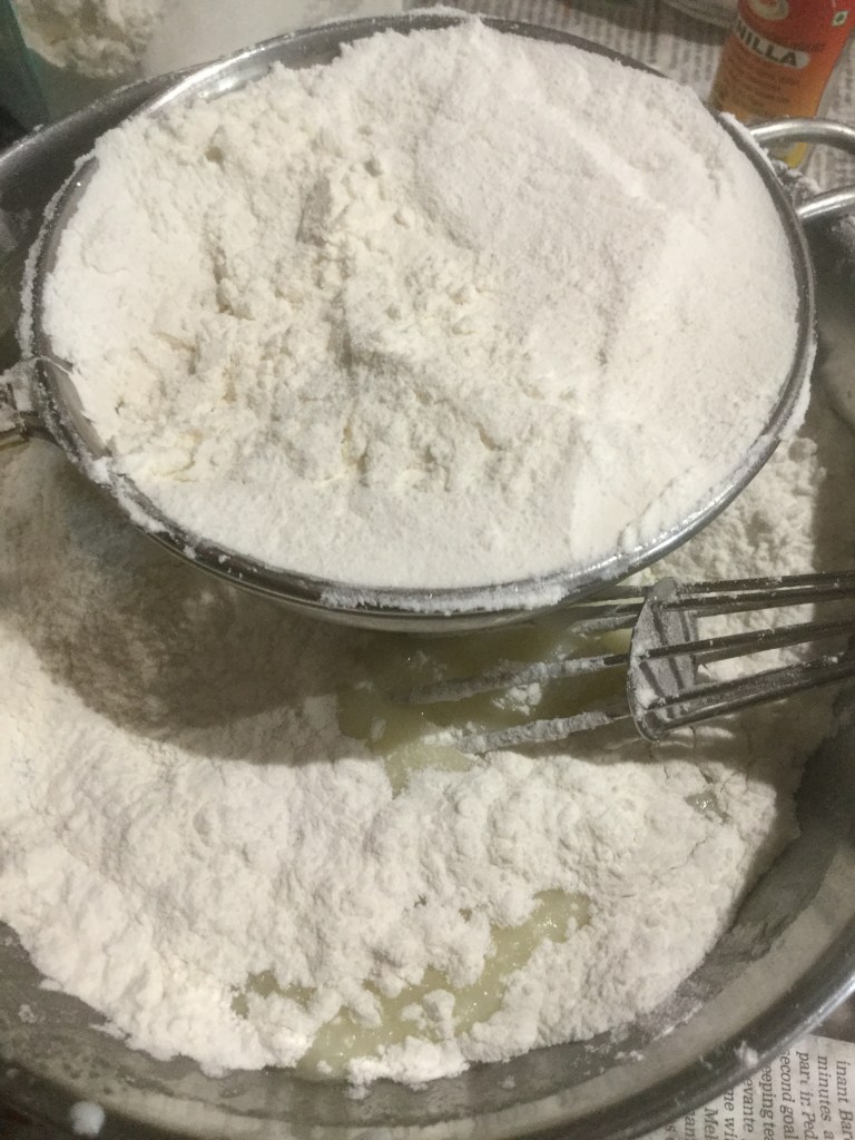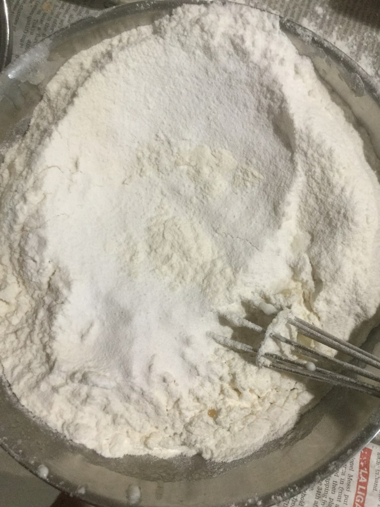 Place a sieve in the bowl over this mixture. In this, add flour, baking powder and baking soda.