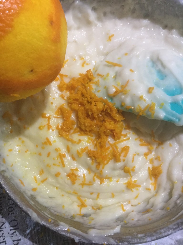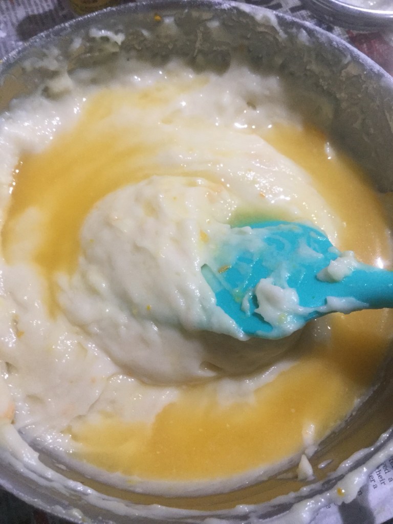Squeeze out the juice and add it little by little into the batter. This would almost be ¾ cup orange juice. Also, grate the orange skin of the orange. Make sure you don’t grate the white coloured skin as it would make the whole cake bitter. This is called orange zest.