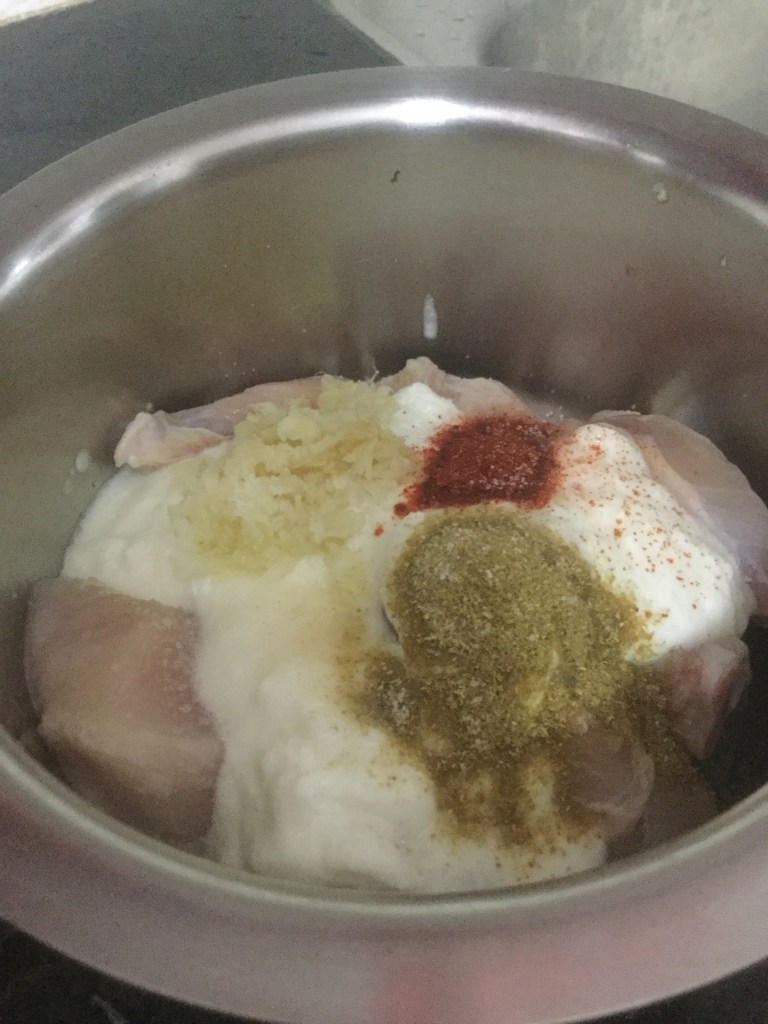 First, add the washed chicken and all the ingredients required for marination in a bowl.