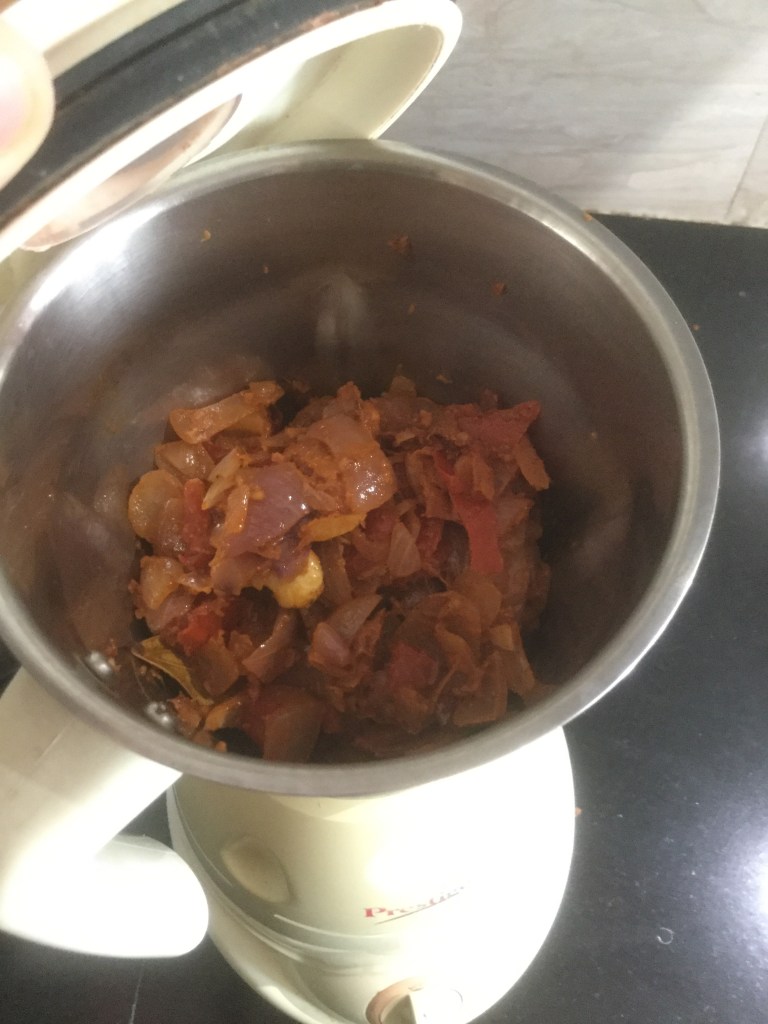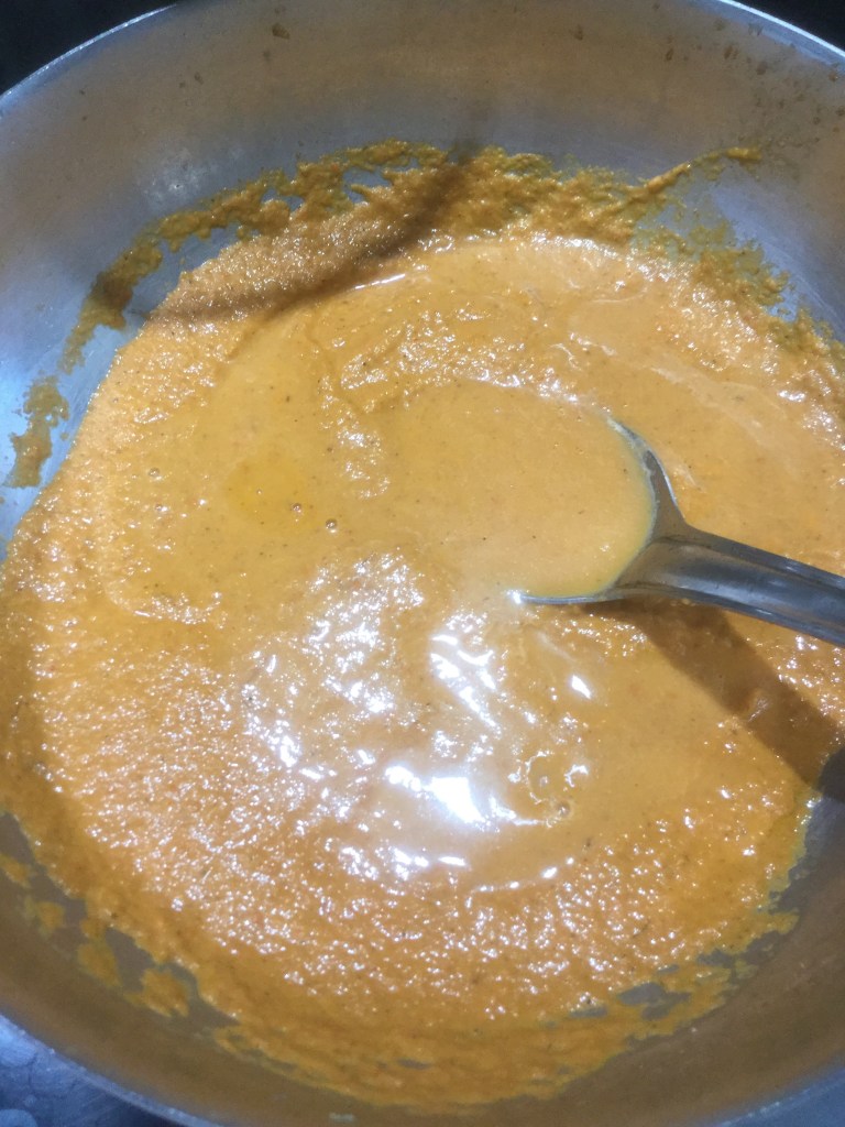 Cashews are there to balance the sourness of the tomatoes. then, let it off the flame. After it is cooled, blend it finely in a blender jar. It would be very thick so use water to thin it out.