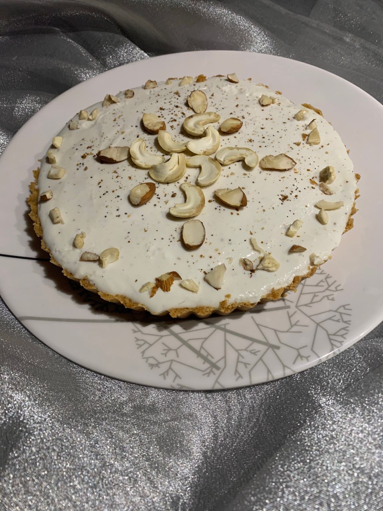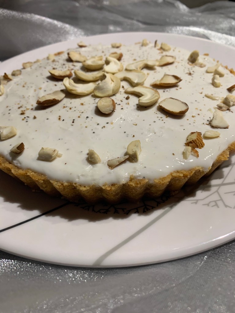 Also mix in the cardamom. Spread this evenly until the ends of the tart on the previously set layer. Place this in the freezer for 1 hour or in the fridge for 3-4 hours. Serve with a garnish of sliced cashew nuts!