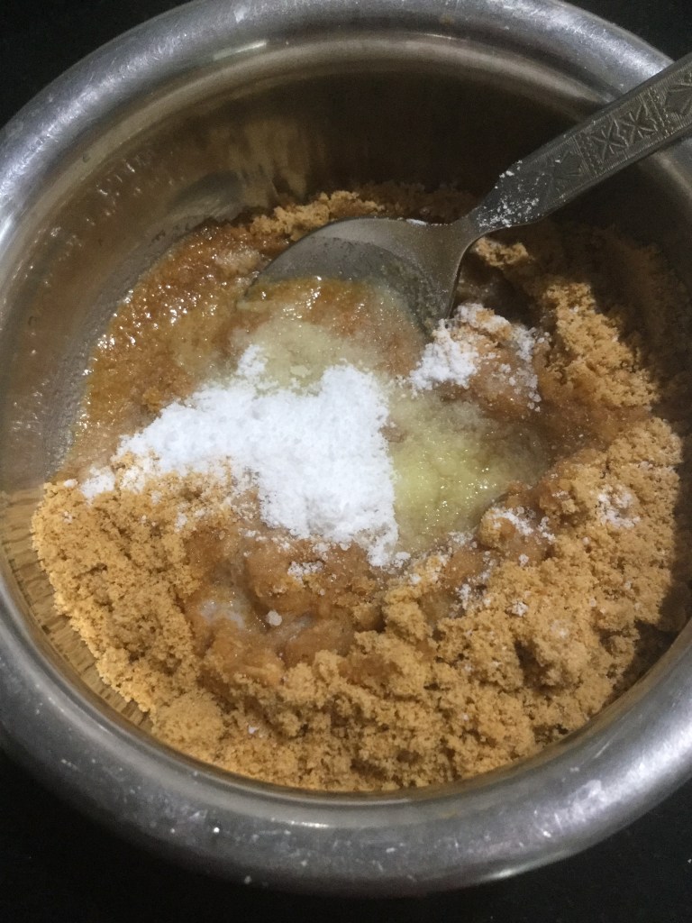 First, add the butter to the powdered biscuits. You can use any brand you have. I am using nutri choice. Give it a good mix so that butter is distributed evenly. If you want, you could also add a little sugar.