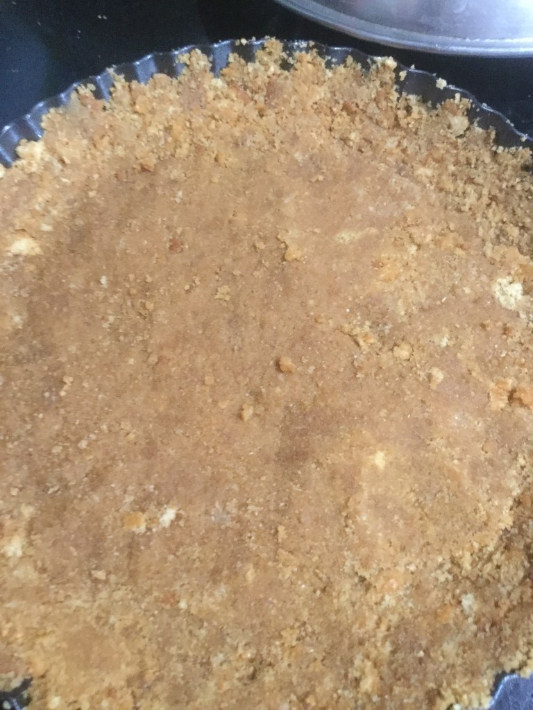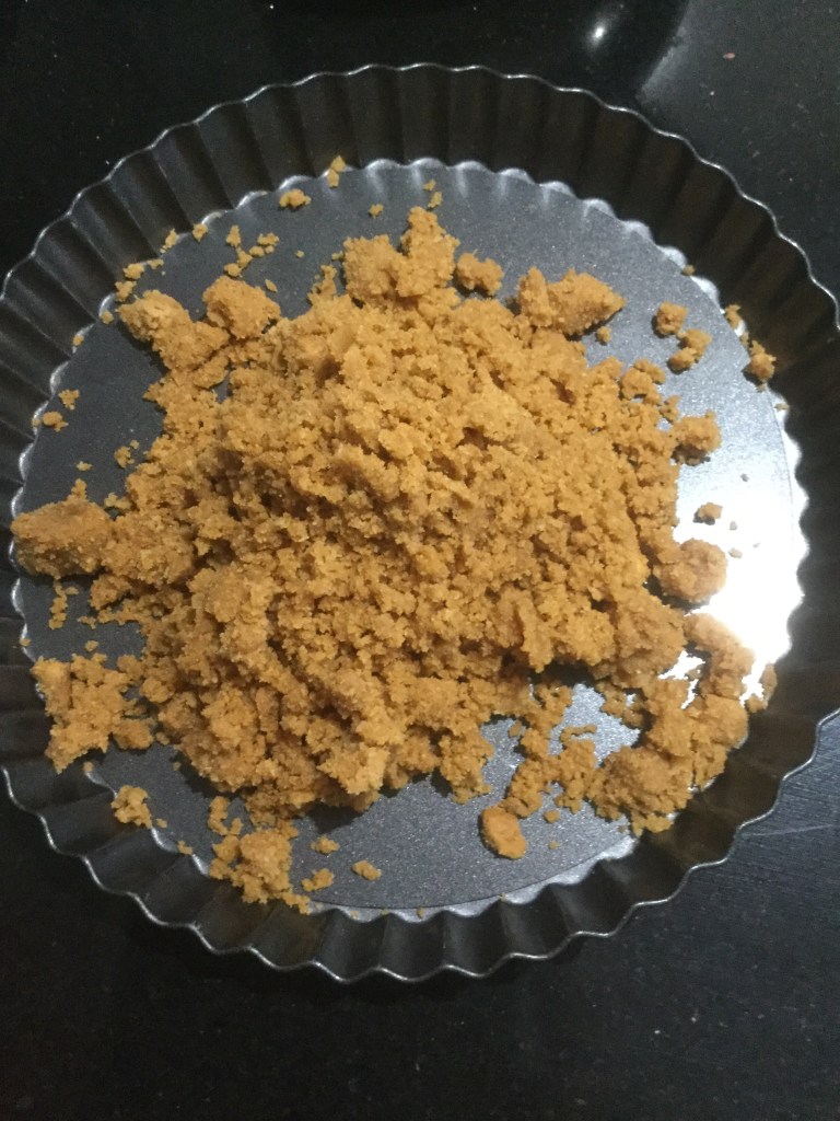Take a tart mold (which is removable and separable from its bottom) and add this mixture to it. Spread evenly with your hands and make sure that it reaches until the edges.