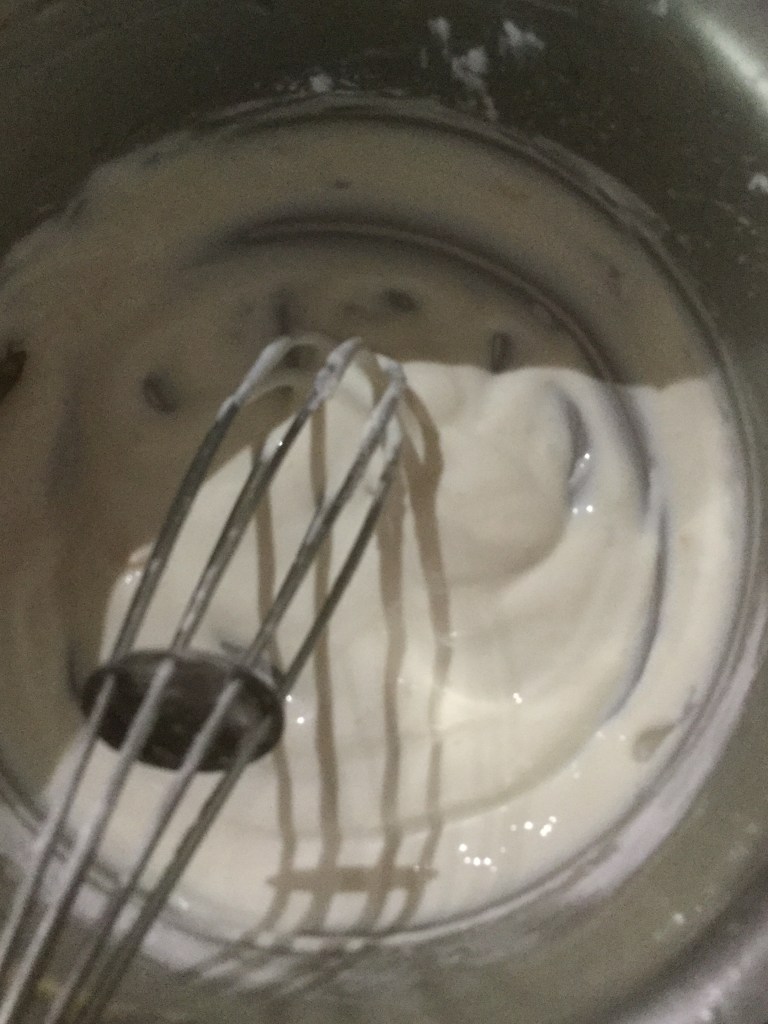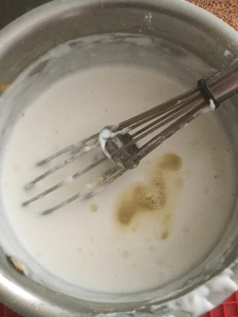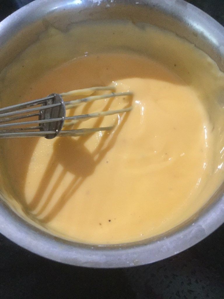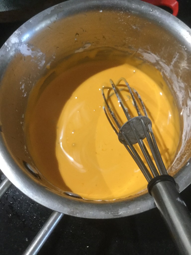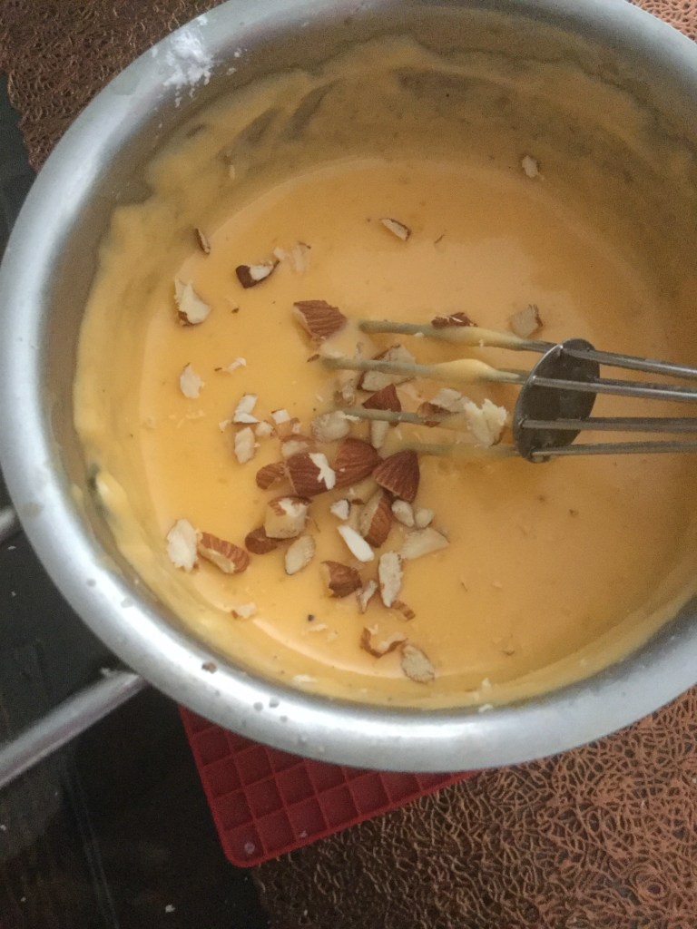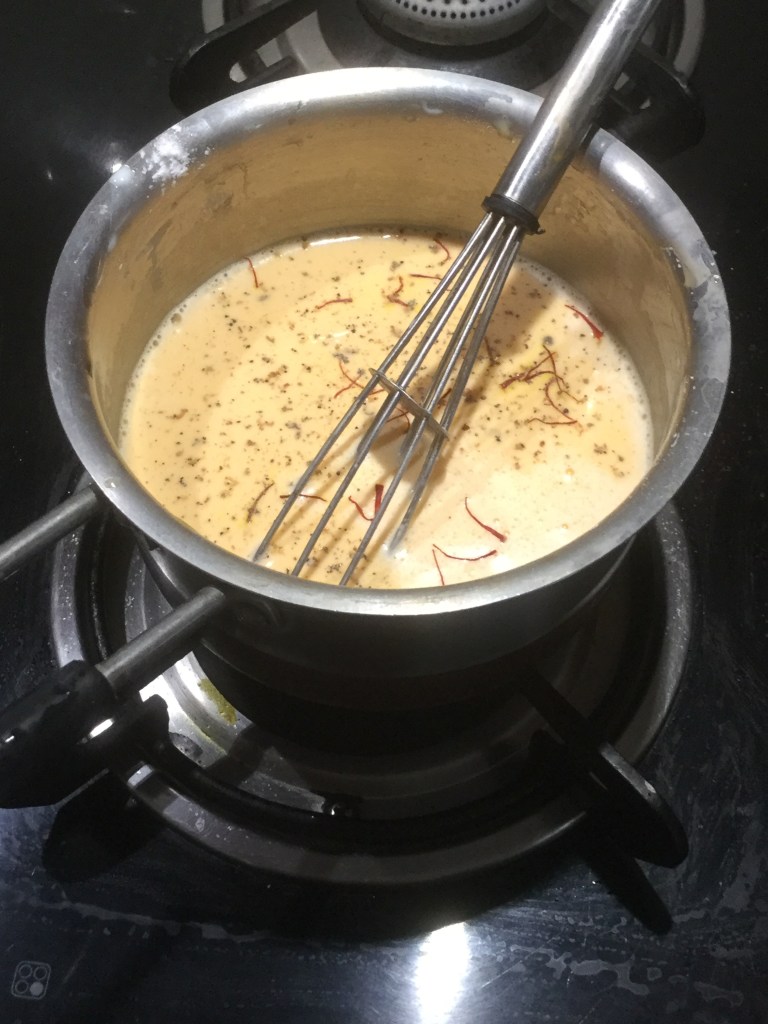 Next, place it on the heat and whisk on low flame until thickened. Add the saffron and the food color if you want.
