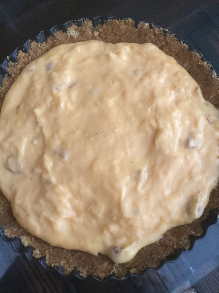 Add some chopped nuts as well. Cool it down and spread it evenly in the tart set before. Place in freezer for 20 minutes.