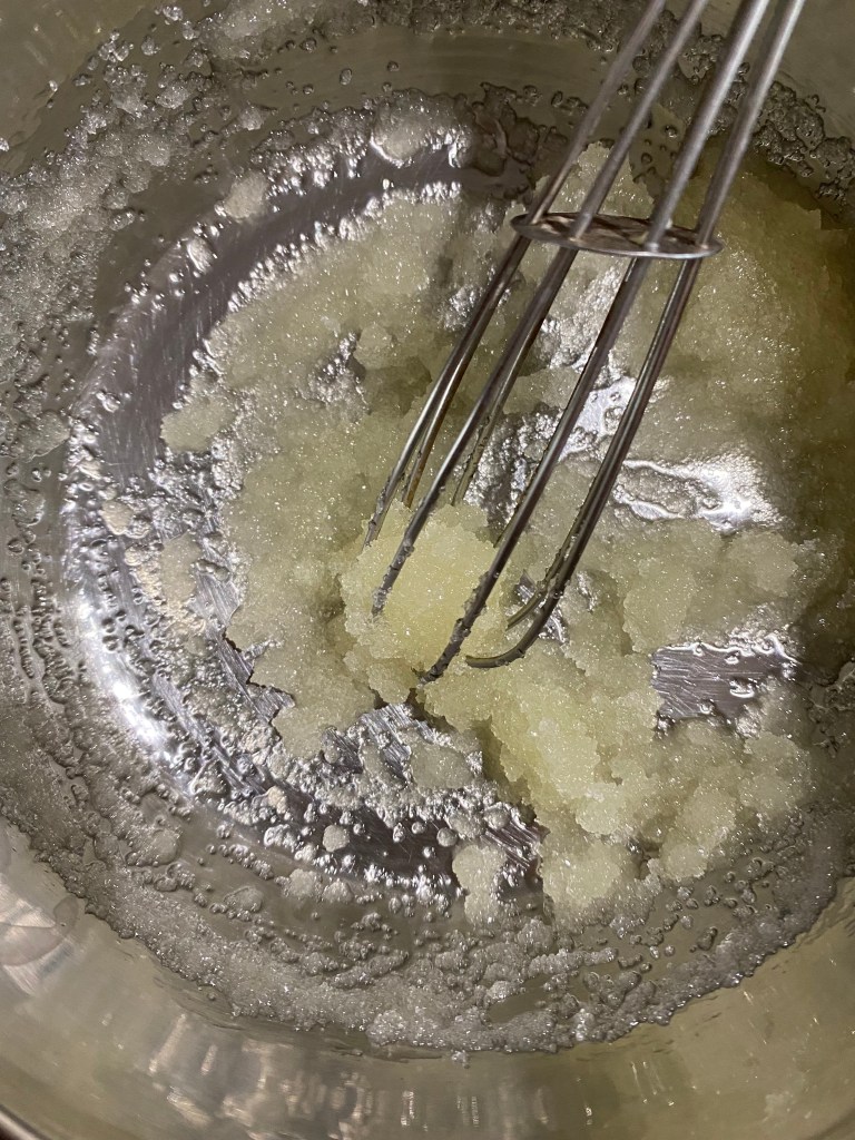 First, whisk together oil and sugar to incorporate air into this cake batter.