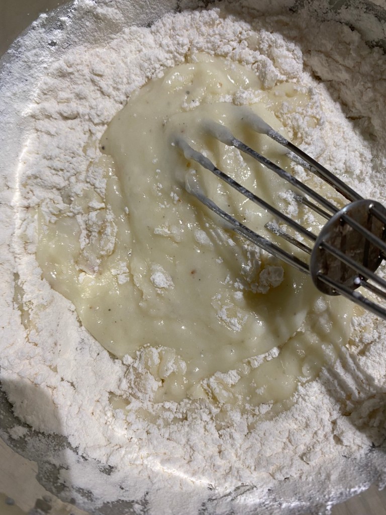 Add the flour, baking powder and soda and there is no need to sieve in this batter as there are other elements on the plate as well.