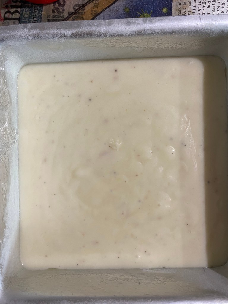 Pour it in a greased square tin and bake at 180 degree C for 20-25 minutes in a preheated oven.